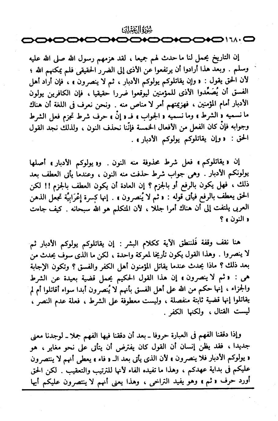 هنا نقف وقفة فَلننطق الآية ككلام البشر: إن يقاتلوكم يولوكم الأدبار ثم لا ينصروا. وهذا القول يكون تأريخا لمعركة واحدة، لكن ما الذي سوف يحدث من بعد ذلك؟ ماذا يحدث عندما يقاتل المؤمنون أهل الكفر والفسق؟ وتكون الإجابة هي: {ثُمَّ لاَ يُنصَرُونَ} إن هذا القول الحكيم يحمل قضية بعيدة عن الشرط والجزاء، إنها حكم من الله على أهل الفسق بأنهم لا يُنصرون أبدا سواء أقاتلوا أن لم يقاتلوا إنها قضية ثابتة منفصلة، وليست معطوفة على الشرط، فعلة عدم النصر، ليست القتال، ولكنها الكفر.