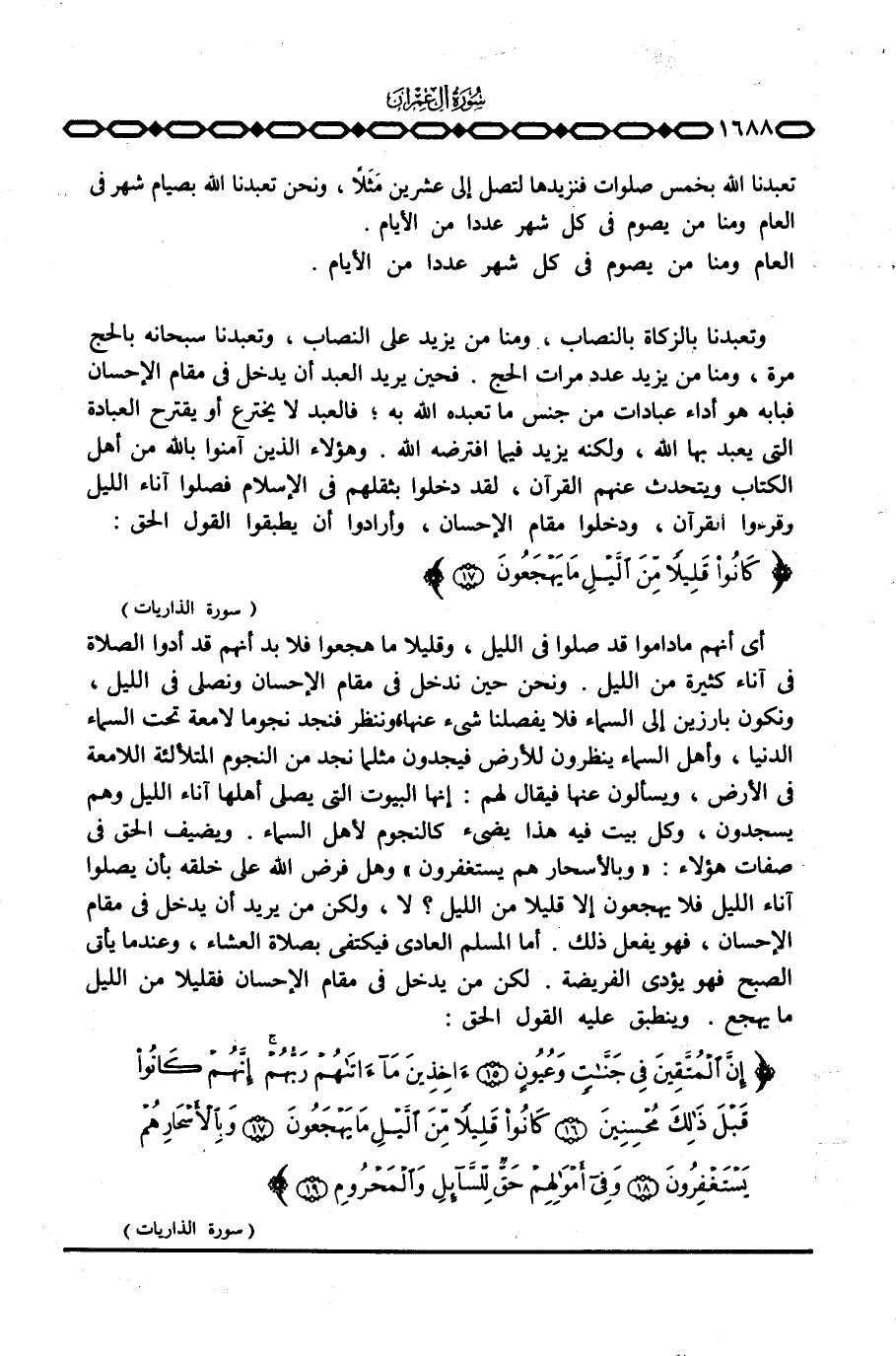أي أنهم ما داموا قد صلوا في الليل، وقليلا ما هجعوا فلا بد أنهم قد أدوا الصلاة في آناء كثيرة من الليل. ونحن حين ندخل في مقام الإحسان ونصلي في الليل، ونكون بارزين إلى السماء فلا يفصلنا شيء عنها، وننظر فنجد نجوما لامعة تحت السماء الدنيا، وأهل السماء ينظرون للأرض فيجدون مثلما نجد من النجوم المتلألئة اللامعة في الأرض، ويسألون عنها فيقال لهم: إنها البيوت التي يصلي أهلها آناء الليل وهم يسجدون، وكل بيت فيه هذا يضيء كالنجوم لأهل السماء. ويضيف الحق في صفات هؤلاء: {وبالأسحار هُمْ يَسْتَغْفِرُونَ} وهل فرض الله على خلقه بأن يصلوا آناء الليل فلا يهجعون إلا قليلا من الليل؟ لا، ولكن من يريد أن يدخل في مقام الإحسان، فهو يفعل ذلك. أما المسلم العادي فيكتفي بصلاة العشاء، وعندما يأتي الصبح فهو يؤدي الفريضة. لكن من يدخل في مقام الإحسان فقليلا من الليل ما يهجع. وينطبق عليه القول الحق: {إِنَّ المتقين فِي جَنَّاتٍ وَعُيُونٍ آخِذِينَ مَآ آتَاهُمْ رَبُّهُمْ إِنَّهُمْ كَانُواْ قَبْلَ ذَلِكَ مُحْسِنِينَ كَانُواْ قَلِيلاً مِّن الليل مَا يَهْجَعُونَ وبالأسحار هُمْ يَسْتَغْفِرُونَ وفي أَمْوَالِهِمْ حَقٌّ لَّلسَّآئِلِ والمحروم} [الذاريات: 15 - 19]