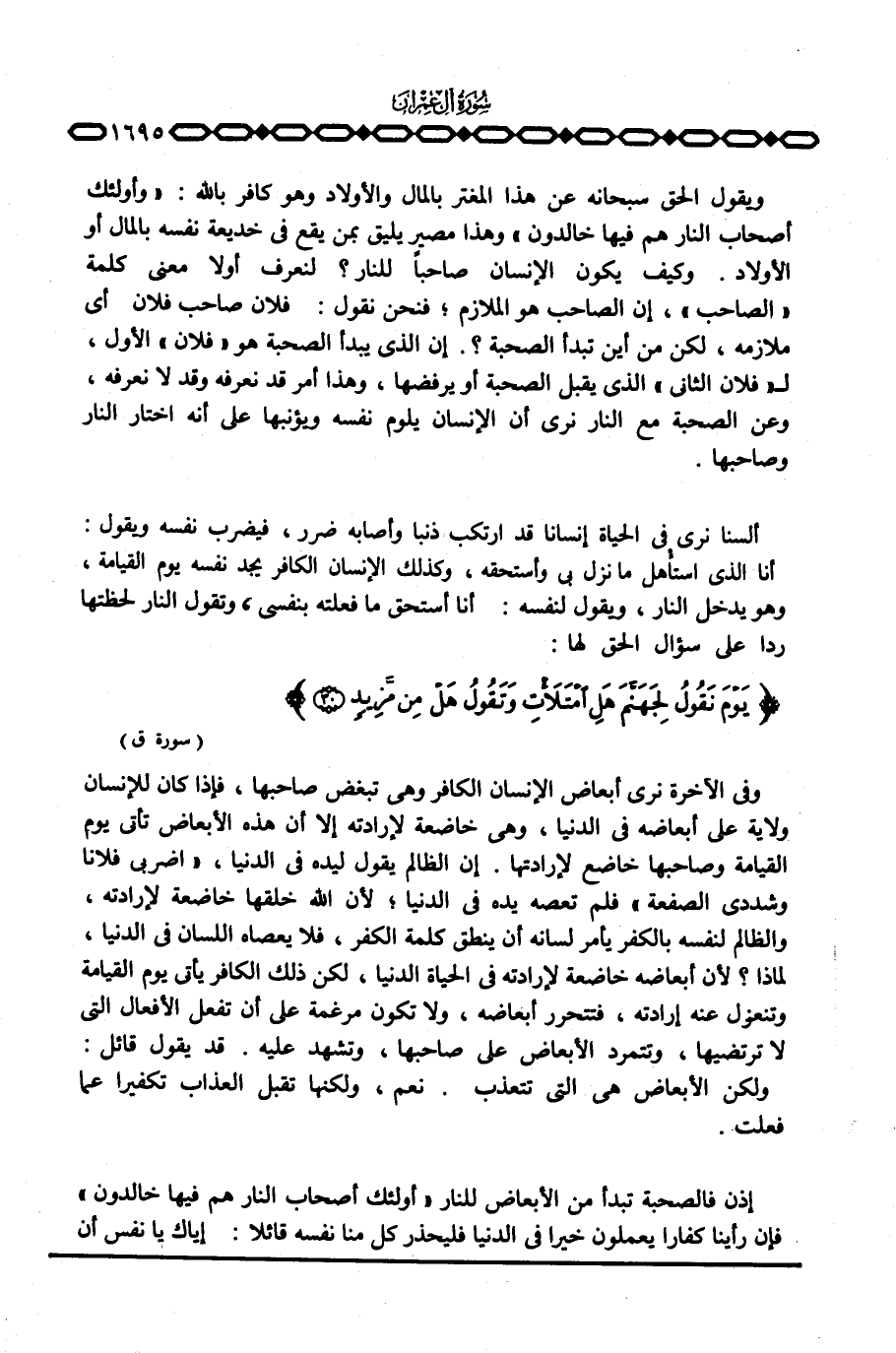 وكيف يكون الإنسان صاحباً للنار؟ لنعرف أولا معنى كلمة «الصاحب» ، إن الصاحب هو الملازم؛ فنحن نقول: فلان صاحب فلان أي ملازمه، لكن من أين تبدأ الصحبة؟ . إن الذي يبدأ الصحبة هو «فلان» الأول، ل «فلان الثاني» الذي يقبل الصحبة أو يرفضها، وهذا أمر قد نعرفه وقد لا نعرفه، وعن الصحبة مع النار نرى أن الإنسان يلوم نفسه ويؤنبها على أنه اختار النار وصاحبها.