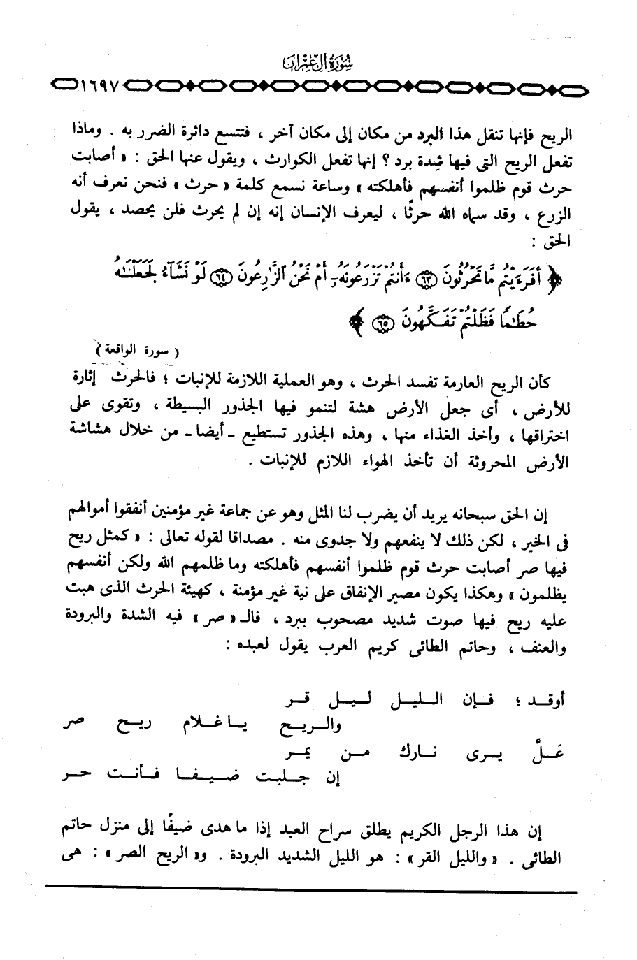 الريح فإنها تنقل هذا البرد من مكان إلى مكان آخر، فتتسع دائرة الضرر به. وماذا تفعل الريح التي فيها شِدة برد؟ إنها تفعل الكوارث، ويقول عنها الحق: {أَصَابَتْ حَرْثَ قَوْمٍ ظلموا أَنْفُسَهُمْ فَأَهْلَكَتْهُ} وساعة نسمع كلمة «حرث» فنحن نعرف أنه الزرع، وقد سماه الله حرثاً، ليعرف الإنسان إنه إن لم يحرث فلن يحصد، يقول الحق: {أَفَرَأَيْتُم مَّا تَحْرُثُونَ أَأَنتُمْ تَزْرَعُونَهُ أَمْ نَحْنُ الزارعون لَوْ نَشَآءُ لَجَعَلْنَاهُ حُطَاماً فَظَلْتُمْ تَفَكَّهُونَ} [الواقعة: 63 - 65]