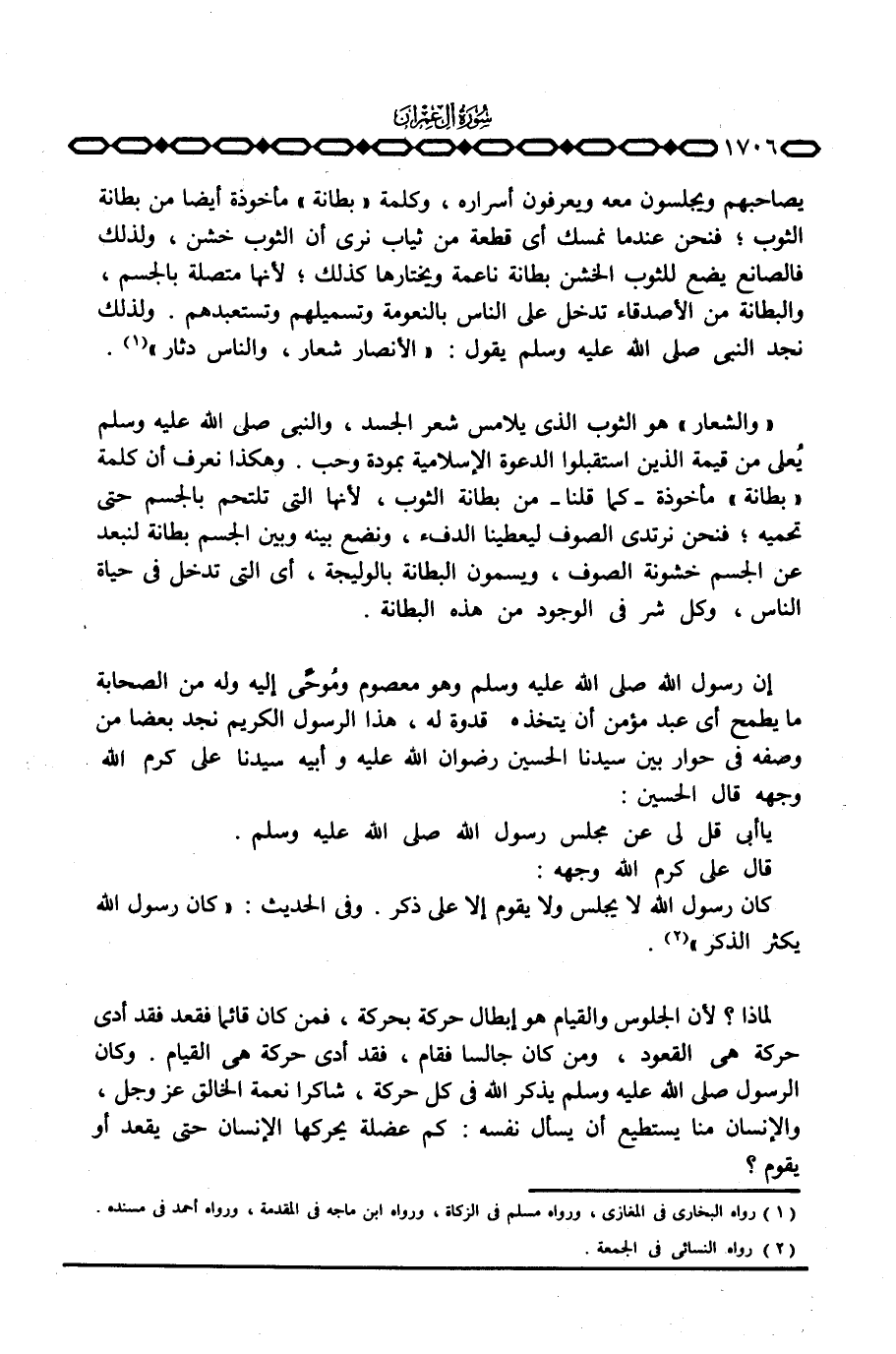 «والشعار» هو الثوب الذي يلامس شعر الجسد، والنبي صَلَّى اللَّهُ عَلَيْهِ وَسَلَّم َ يُعلي من قيمة الذين استقبلوا الدعوة الإسلامية بمودة وحب. وهكذا نعرف أن كلمة «بطانة» مأخوذة - كما قلنا - من بطانة الثوب، لأنها التي تلتحم بالجسم حتى تحميه؛ فنحن نرتدي الصوف ليعطينا الدفء، ونضع بينه وبين الجسم بطانة لنبعد عن الجسم خشونة الصوف، ويسمون البطانة بالوليجة، أي التي تدخل في حياة الناس، وكل شر في الوجود من هذه البطانة.