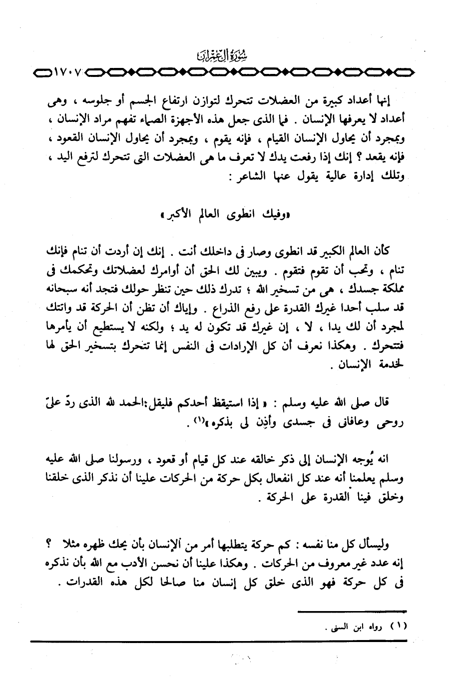 «وفيك انطوى العالم الأكبر» ... كأن العالم الكبير قد انطوى وصار في داخلك أنت. إنك إن أردت أن تنام فإنك تنام، وتحب أن تقوم فتقوم. ويبين لك الحق أن أوامرك لعضلاتك وتحكمك في مملكة جسدك، هي من تسخير الله؛ تدرك ذلك حين تنظر حولك فتجد أنه سبحانه قد سلب أحدا غيرك القدرة على رفع الذراع. وإياك أن تظن أن الحركة قد واتتك لمجرد أن لك يدا، لا، إن غيرك قد تكون له يد؛ لكنه لا يستطيع أن يأمرها فتتحرك. وهكذا نعرف أن كل الإرادات في النفس إنما تتحرك بتسخير الحق لها لخدمة الإنسان.