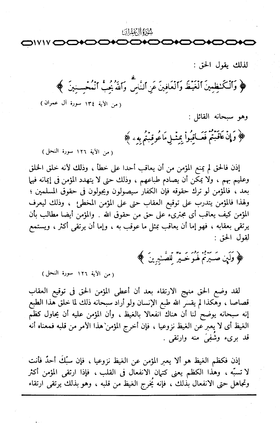 لقد وضع الحق منهج الارتقاء بعد أن أعطى المؤمن الحق في توقيع العقاب قصاصا، وهكذا لم يقسر الله طبع الإنسان ولو أراد سبحانه ذلك لما خلق هذا الطبع إنه سبحانه يوضح لنا أن هناك انفعالا بالغيظ، وأن المؤمن عليه أن يحاول كظم الغيظ أي لا يعبر عن الغيظ نزوعيا، فإن أخرج المؤمن هذا الأمر من قلبه فمعناه أنه قد برئ وشُفِيَ منه وارتقى.