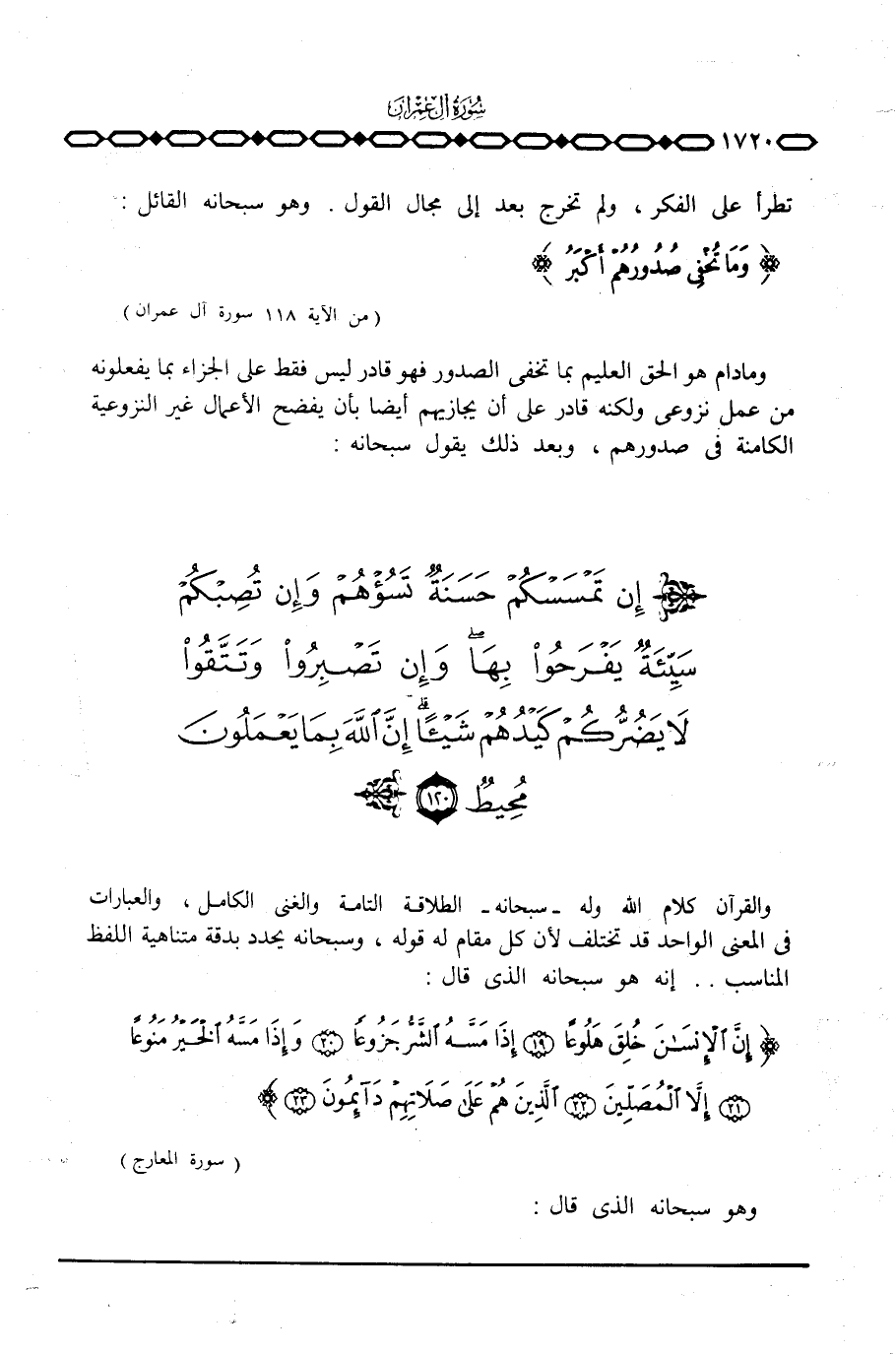 وما دام هو الحق العليم بما تخفي الصدور فهو قادر ليس فقط على الجزاء بما يفعلونه من عمل نزوعي ولكنه قادر على أن يجازيهم أيضا بأن يفضح الأعمال غير النزوعية الكامنة في صدروهم، وبعد ذلك يقول سبحانه: {إِن تَمْسَسْكُمْ حَسَنَةٌ تَسُؤْهُمْ وَإِن تُصِبْكُمْ سَيِّئَةٌ يَفْرَحُواْ بِهَا وَإِن تَصْبِرُواْ وَتَتَّقُواْ لاَ يَضُرُّكُمْ كَيْدُهُمْ شَيْئاً ... }