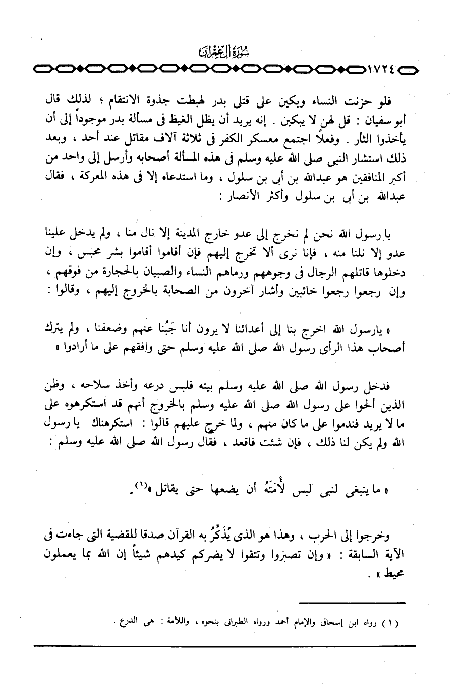 فدخل رسول الله صَلَّى اللَّهُ عَلَيْهِ وَسَلَّم َ بيته فلبس درعه وأخذ سلاحه، وظن الذي ألحوا على رسول الله صَلَّى اللَّهُ عَلَيْهِ وَسَلَّم َ بالخروج أنهم قد استكرهوه على ما لا يريد فندموا على ما كان منهم، ولما خرج عليهم قالوا: استكرهناك يا رسول الله ولم يكن لنا ذلك، فإن شئت فاقعد، فقال رسول الله صَلَّى اللَّهُ عَلَيْهِ وَسَلَّم َ: «ما ينبغي لنبي لبس لأْمَتَهُ أن يضعها حتى يقاتل» .