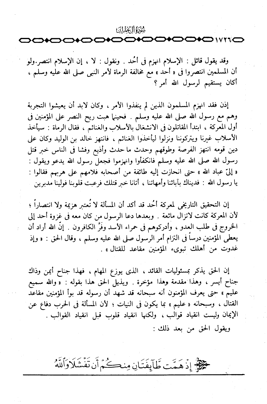 وقد يقول قائل: الإسلام انهزم في أُحد. ونقول: لا، إن الإسلام انتصر. ولو أن المسلمين انتصروا في «أحد» مع مخالفة الرماة لأمر النبي صَلَّى اللَّهُ عَلَيْهِ وَسَلَّم َ، أكان يستقيم لرسول الله أمر؟