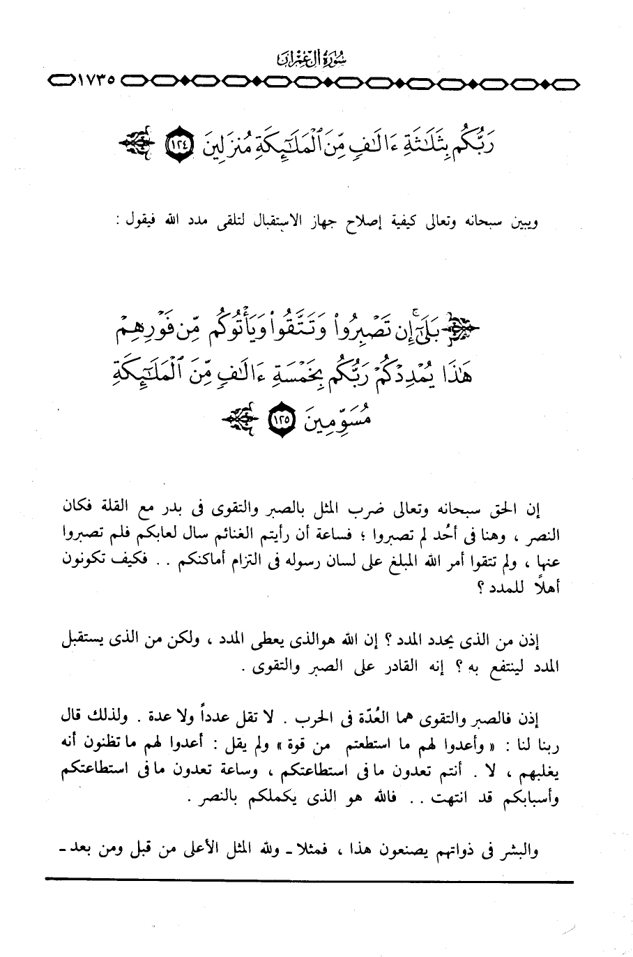 إن الحق سبحانه وتعالى ضرب المثل بالصبر والتقوى في بدر مع القلة فكان النصر، وهنا في أُحد لم تصبروا؛ فساعة أن رأيتم الغنائم سال لعابكم فلم تصبروا عنها، ولم تتقوا أمر الله المبلغ على لسان رسوله في التزام أماكنكم. . فكيف تكونون أهلاً للمدد؟