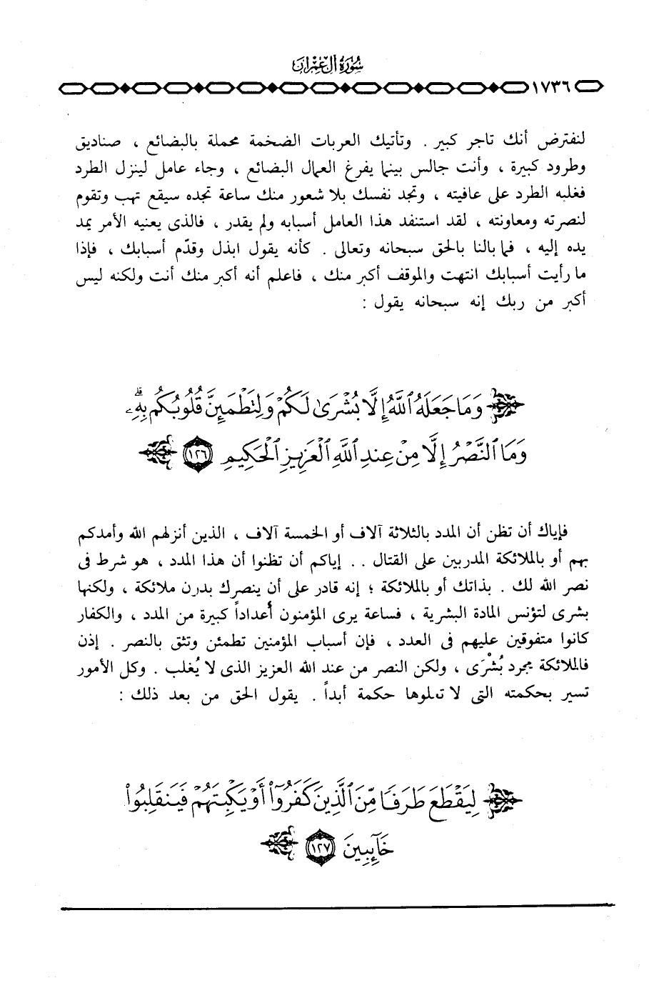لنفترض أنك تاجر كبير. وتأتيك العربات الضخمة محملة بالبضائع، صناديق وطرود كبيرة، وأنت جالس بينما يفرغ العمال البضائع، وجاء عامل لينزل الطرد فغلبه الطرد على عافيته، وتجد نفسك بلا شعور منك ساعة تجده سيقع تهب وتقوم لنصرته ومعاونته، لقد استنفد هذا العامل أسبابه ولم يقدر، فالذي يعنيه الأمر يمد يده إليه، فما بالنا بالحق سبحانه وتعالى. كأنه يقول ابذل وقدّم أسبابك، فإذا ما رأيت أسبابك انتهت والموقف أكبر منك، فاعلم أنه أكبر منك أنت ولكنه ليس أكبر من ربك إنه سبحانه يقول: {وَمَا جَعَلَهُ الله إِلاَّ بشرى لَكُمْ وَلِتَطْمَئِنَّ قُلُوبُكُمْ بِهِ ... }