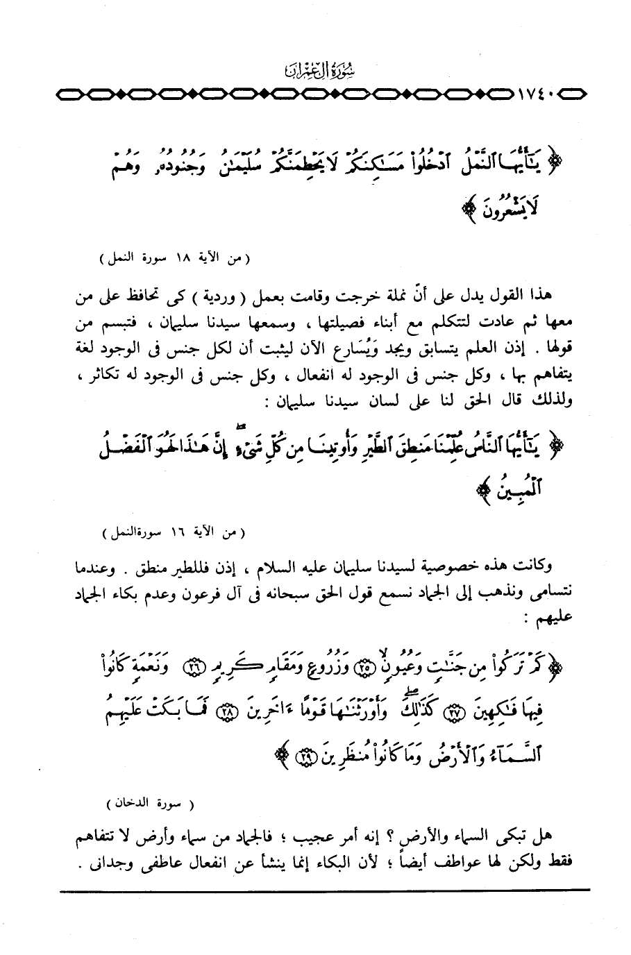 وكانت هذه خصوصية لسيدنا سليمان عليه السلام، إذن فللطير منطق. وعندما نتسامى ونذهب إلى الجماد نسمع قول الحق سبحانه في آل فرعون وعدم بكاء الجماد عليهم: {كَمْ تَرَكُواْ مِن جَنَّاتٍ وَعُيُونٍ وَزُرُوعٍ وَمَقَامٍ كَرِيمٍ وَنَعْمَةٍ كَانُواْ فِيهَا فَاكِهِينَ كَذَلِكَ وَأَوْرَثْنَاهَا قَوْماً آخَرِينَ فَمَا بَكَتْ عَلَيْهِمُ السمآء والأرض وَمَا كَانُواْ مُنظَرِينَ} [الدخان: 25 - 29]