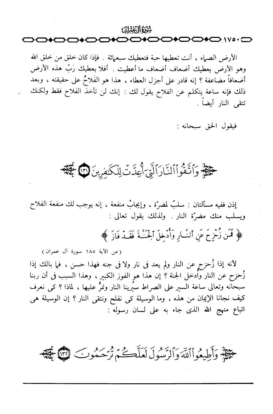 الأرض الصماء، أنت تعطيها حبة فتعطيك سبعمائة. فإذا كان خلق من خلق الله وهو الأرض يعطيك أضعاف أضعاف ما أعطيت. أفلا يعطيك رَبّ هذه الأرض أضعافاً مضاعفة؟ إنه قادر على أجزل العطاء، هذا هو الفَلاحُ على حقيقته، وبعد ذلك فإنه ساعة يتكلم عن الفلاح يقول لك: إنك لن تأخذ الفلاح فقط ولكنك تتقي النار أيضاً.