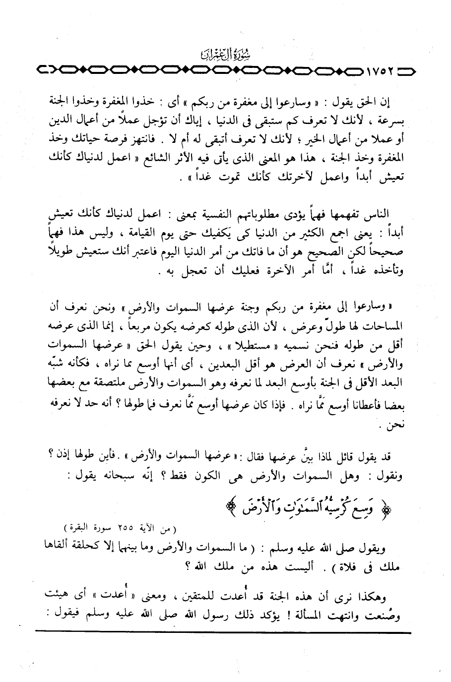 إن الحق يقول: {وسارعوا إلى مَغْفِرَةٍ مِّن رَّبِّكُمْ} أي: خذوا المغفرة وخذوا الجنة بسرعة، لأنك لا تعرف كم ستبقى في الدنيا، إياك أن تؤجل عملاً من أعمال الدين أو عملا من أعمال الخير؛ لأنك لا تعرف أتبقى له أم لا. فانتهز فرصة حياتك وخذ المغفرة وخذ الجنة، هذا هو المعنى الذي يأتي فيه الأثر الشائع «اعمل لدنياك كأنك تعيش أبداً واعمل لآخرتك كأنك تموت غداً» .