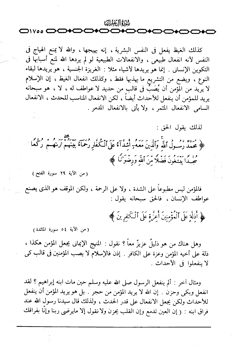 إنما هو يريدها لأشياء مثلا: الغريزة الجنسية، هو يريدها لبقاء النوع، ويضع من التشريع ما يهذبها فقط، وكذلك انفعال الغيظ، إن الإسلام لا يريد من المؤمن أن يُصَبَّ في قالب من حديد لا عواطف له، لا، هو سبحانه يريد للمؤمن أن ينفعل للأحداث أيضاً، لكن الانفعال المناسب للحدث، الانفعال السامي الانفعال المثمر، ولا يأتي بالانفعال المدمر.
