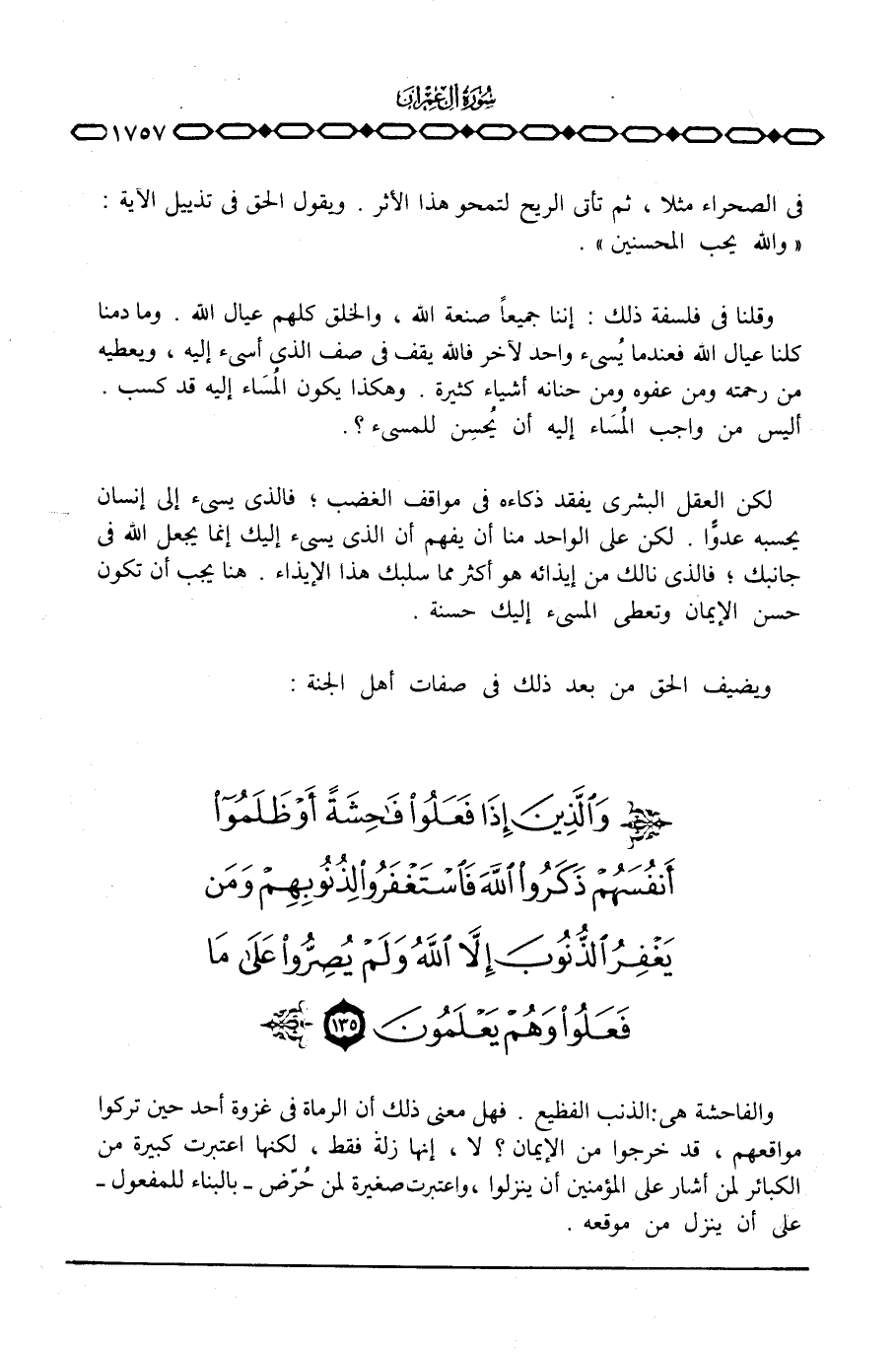 ويضيف الحق من بعد ذلك في صفات أهل الجنة: {والذين إِذَا فَعَلُواْ فَاحِشَةً أَوْ ظلموا أَنْفُسَهُمْ ذَكَرُواْ الله فاستغفروا لِذُنُوبِهِمْ وَمَن يَغْفِرُ الذنوب إِلاَّ الله ... }