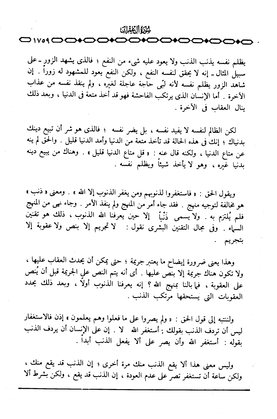 ويقول الحق: {فاستغفروا لِذُنُوبِهِمْ وَمَن يَغْفِرُ الذنوب إِلاَّ الله} . ومعنى «ذنب» هو مخالفة لتوجيه منهج. فقد جاء أمر من المنهج ولم ينفذ الأمر. وجاء نهي من المنهج فلم يُلتزم به. ولا يسمى ذَنْباً إلا حين يعرفنا الله الذنوب، ذلك هو تقنين السماء. وفي مجال التقنين البشري نقول: لا تجريم إلا بنص ولا عقوبة إلا بتجريم.
