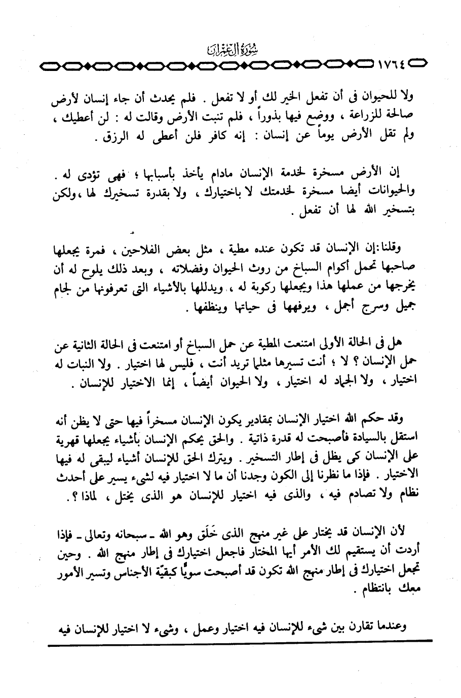 إن الأرض مسخرة لخدمة الإنسان ما دام يأخذ بأسبابها؛ فهي تؤدي له. والحيوانات أيضا مسخرة لخدمتك لا باختيارك، ولا بقدرة تسخيرك لها، ولكن بتسخير الله لها أن تفعل.
