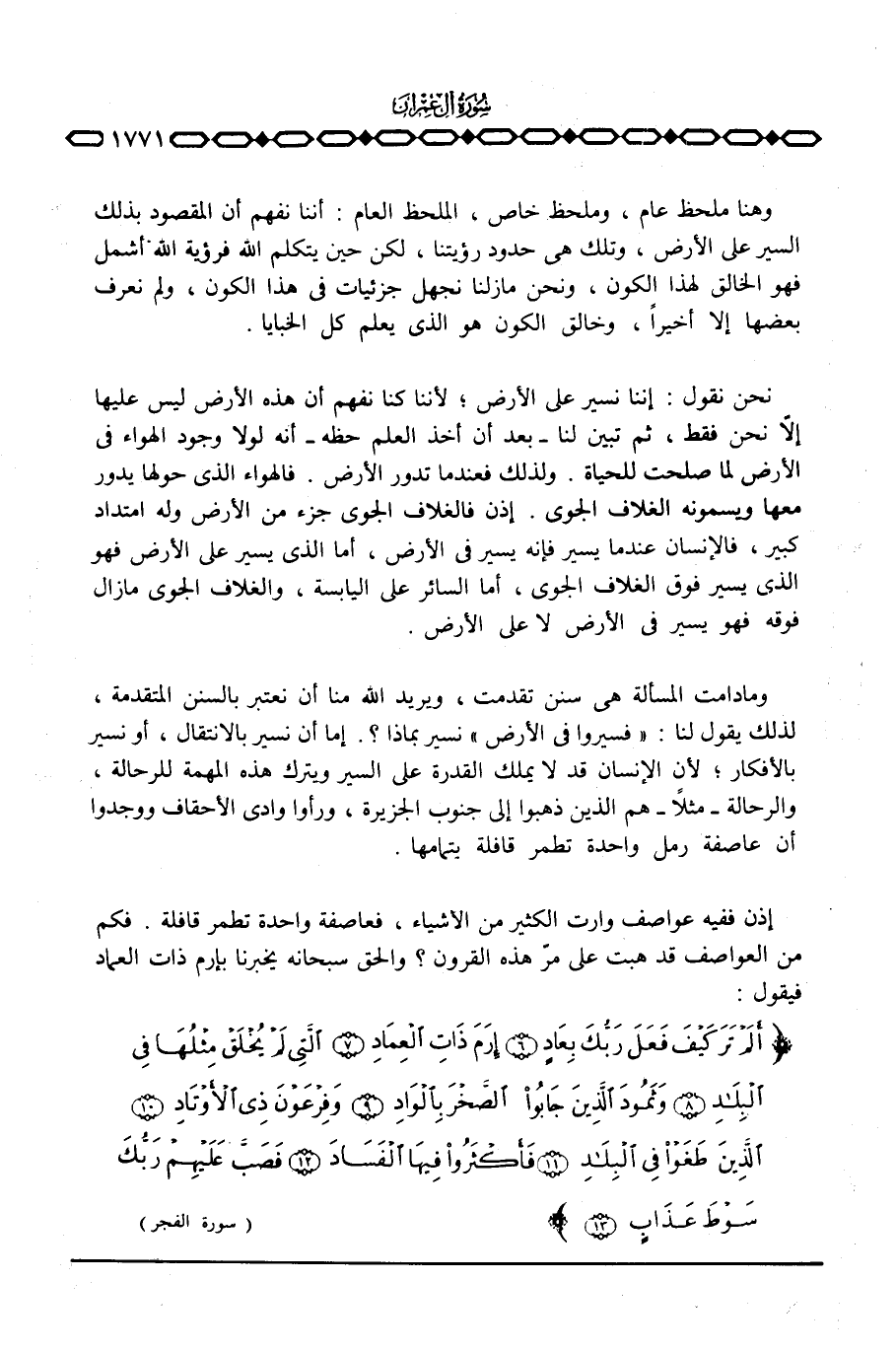 نحن نقول: إننا نسير على الأرض؛ لأننا كنا نفهم أن هذه الأرض ليس عليها إلاّ نحن فقط، ثم تبين لنا - بعد أن أخذ العلم حظه - أنه لولا وجود الهواء في الأرض لما صلحت للحياة. ولذلك فعندما تدور الأرض. فالهواء الذي حولها يدور معها ويسمونه الغلاف الجوي إذن فالغلاف الجوي جزء من الأرض وله امتداد كبير، فالإنسان عندما يسير فإنه يسير في الأرض، أما الذي يسير على الأرض فهو الذي يسير فوق الغلاف الجوي، أما السائر على اليابسة، والغلاف الجوي ما زال فوقه فهو يسير في الأرض لا على الأرض.