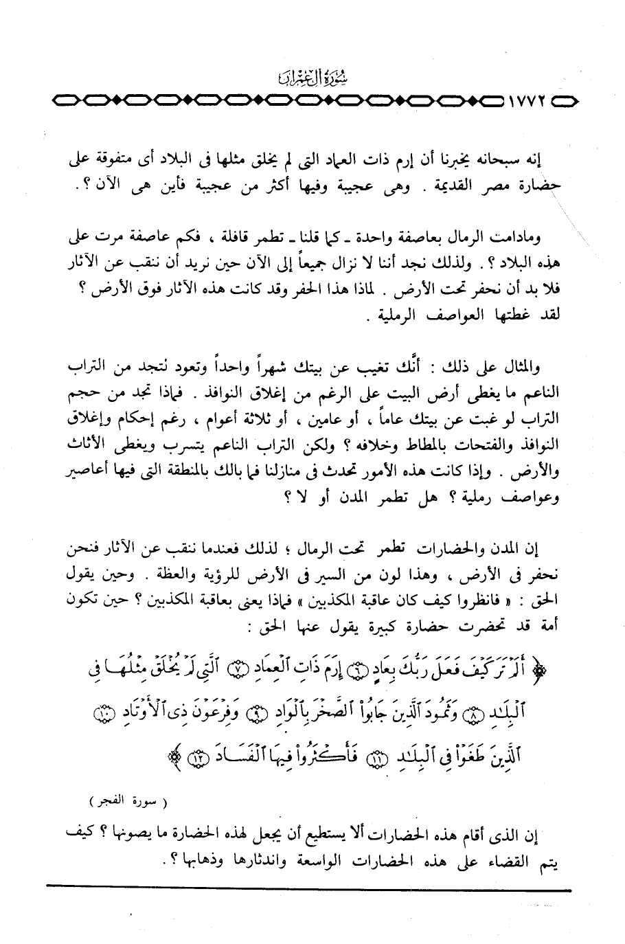 وما دامت الرمال بعاصفة واحدة - كما قلنا - تطمر قافلة، فكم عاصفة مرت على هذه البلاد؟ . ولذلك نجد أننا لا نزال جميعاً إلى الآن حين نريد أن ننقب عن الآثار فلا بد أن نحفر تحت الأرض. لماذا هذا الحفر وقد كانت هذه الآثار فوق الأرض؟ لقد غطتها العواصف الرملية.