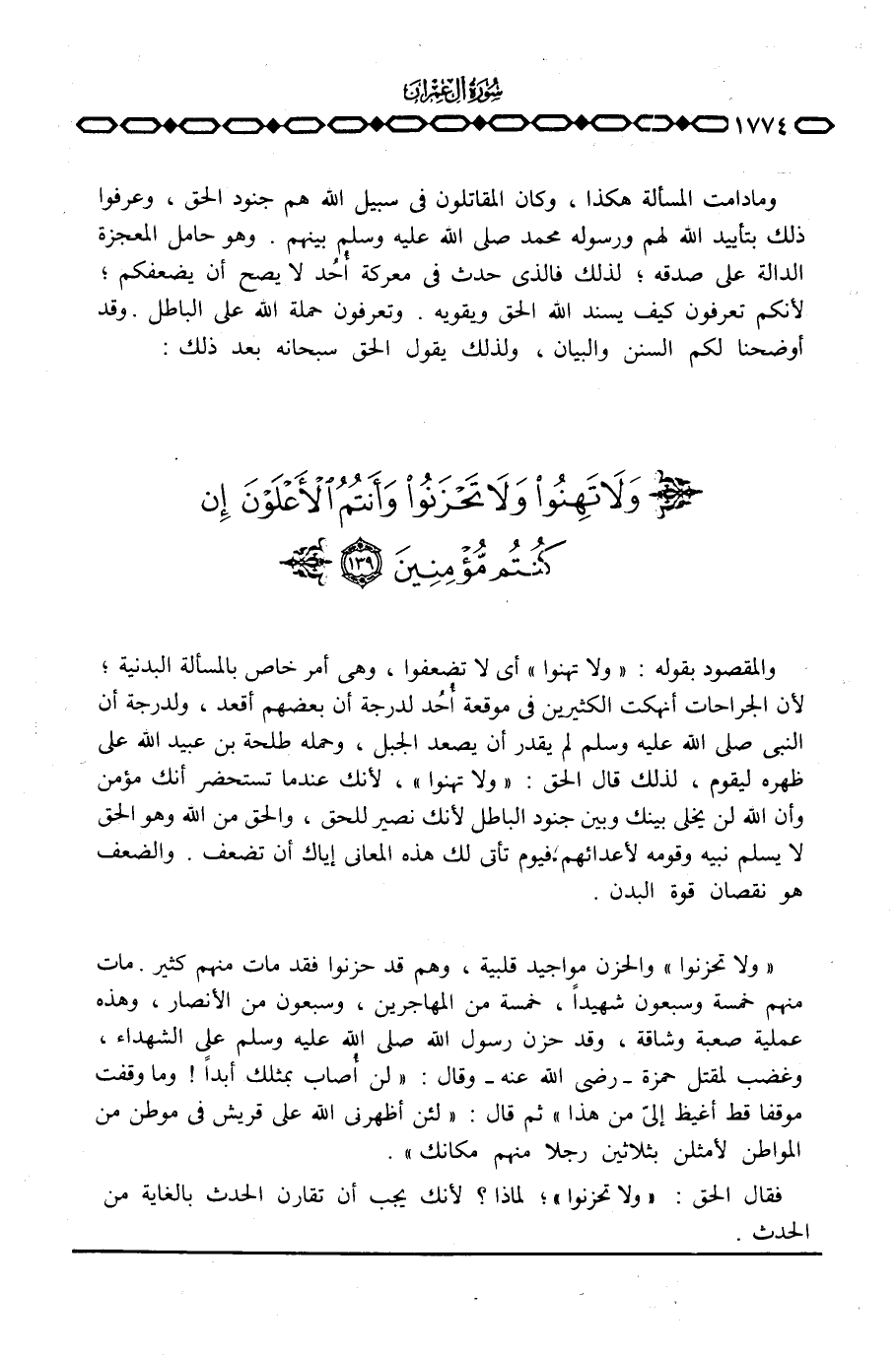 {وَلاَ تَحْزَنُوا} والحزن مواجيد قلبية، وهم قد حزنوا فقد مات منهم كثير. مات منهم خمسة وسبعون شهيداً، خمسة من المهاجرين، وسبعون من الأنصار، وهذه عملية صعبة وشاقة، وقد حزن رسول الله صَلَّى اللَّهُ عَلَيْهِ وَسَلَّم َ على الشهداء، وغضب لمقتل حمزة - رَضِيَ اللَّهُ عَنْه - وقال: «لن أُصاب بمثلك أبداً! وما وقفت موقفا قط أغيظ إلىّ من هذا» ثم قال: «لئن أظهرني الله على قريش في موطن من المواطن لأمثلن بثلاثين رجلا منهم مكانك» .
