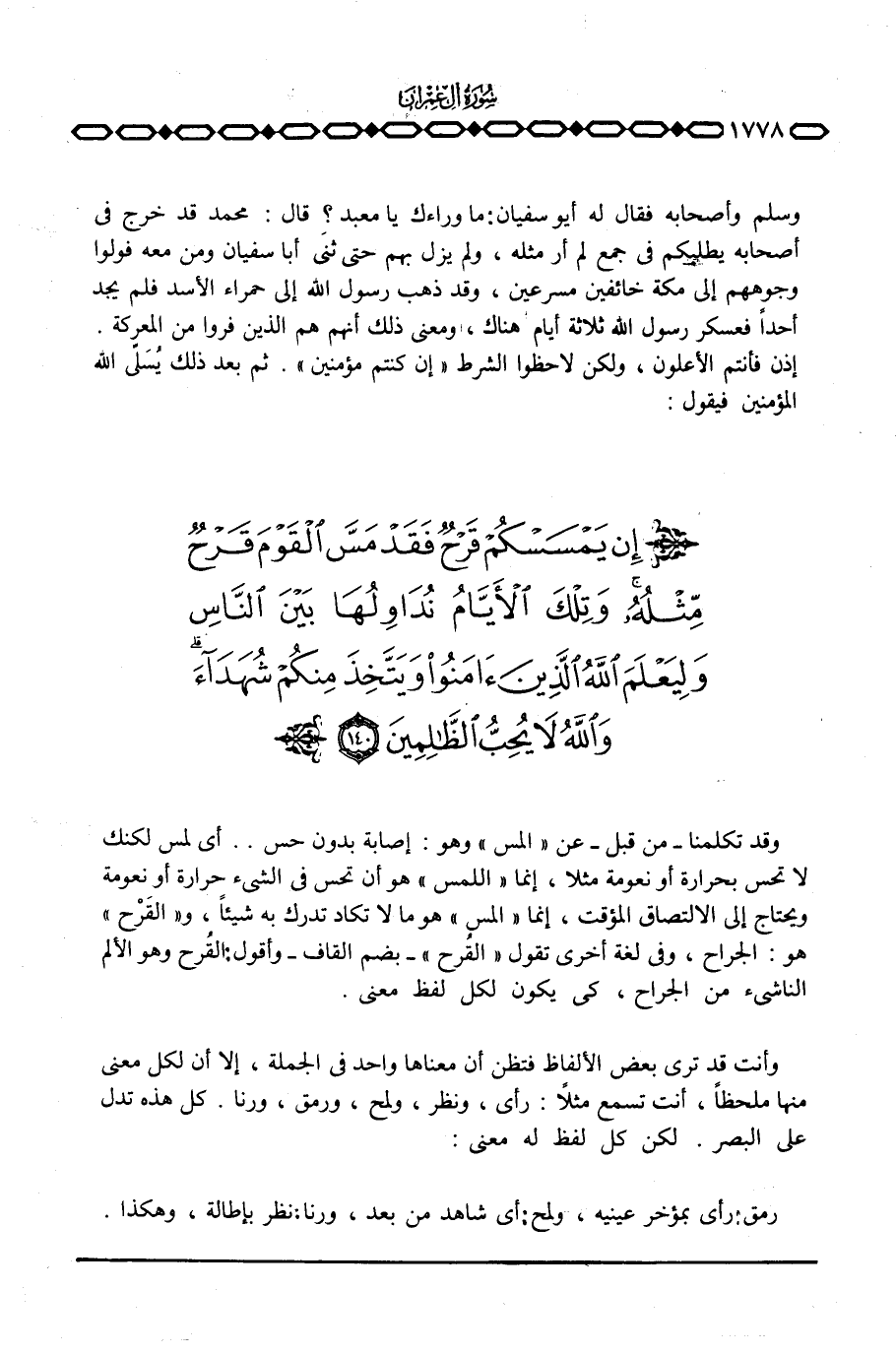 وقد تكلمنا - من قبل - عن «المس» وهو: إصابة بدون حس. . أي لمس لكنك لا تحس بحرارة أو نعومة مثلا، إنما «اللمس» هو أن تحس في الشيء حرارة أو نعومة ويحتاج إلى الالتصاق المؤقت، إنما «المس» هو ما لا تكاد تدرك به شيئاً، «والقَرْح» هو: الجراح، وفي لغة أخرى تقول «القُرح» - بضم القاف - وأقول: القٌرح وهو الألم الناشئ من الجراح، كي يكون لفظ معنى.