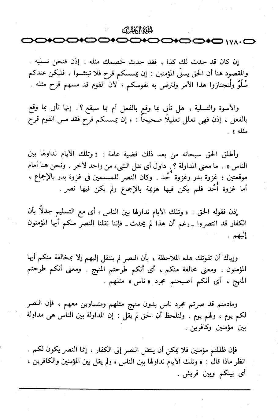 إن كان قد حدث لك كذا، فقد حدث لخصمك مثله. إذن فنحن نسليه. والمقصود هنا أن الحق يسلّي المؤمنين: إن يمسسكم قرح فلا تبتئسوا، فليكن عندكم سُلّوٌ ولْتجتازوا هذا الأمر ولترض به نفوسكم؛ لأن القوم قد مسهم قرح مثله.