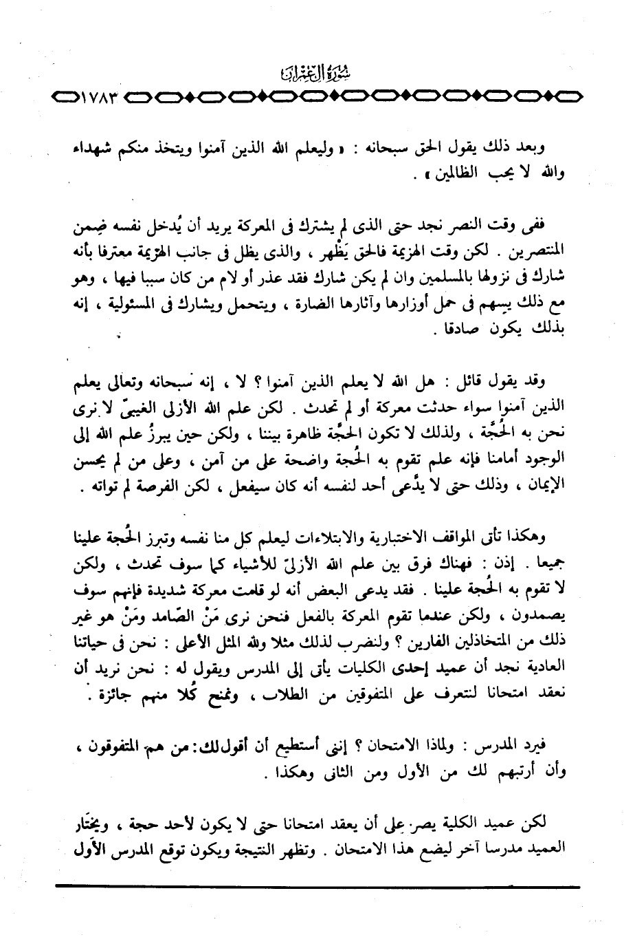 وهكذا تأتي المواقف الاختبارية والابتلاءات ليعلم كل منا نفسه وتبرز الحُجة علينا جميعا. إذن: فهناك فرق بين علم الله الأزليّ للأشياء كما سوف تحدث، ولكن لا تقوم به الحُجّة علينا. فقد يدعى البعض أنه لو قامت معركة شديدة فإنهم سوف يصمدون، ولكن عندما تقوم المعركة بالفعل فنحن نرى مَنْ الصّامد ومَنْ هو غير ذلك من المتخاذلين الفارين؟ ولنضرب لذلك مثلا ولله المثل الأعلى: نحن في حياتنا العادية نجد أن عميد إحدى الكليات يأتي إلى المدرس ويقول له: نحن نريد أن نعقد امتحانا لنتعرف على المتفوقين من الطلاب، ونمنح كُلا منهم جائزة.