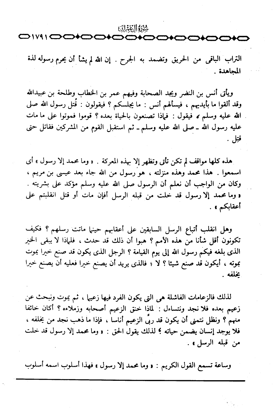 وهل انقلب أتباع الرسل السابقين على أعقابهم حينما ماتت رسلهم؟ فكيف تكونون أقل شأنا من هذه الأمم؟ هبوا أن ذلك قد حدث، فلماذا لا يبقى الخير الذي بلغه فيكم رسول الله إلى يوم القيامة؟ الرجل الذي يكون قد صنع خيرا يموت بموته، أيكون قد صنع شيئا؟ لا؛ فالذي يريد أن يصنع خيرا فعليه أن يصنع خيرا يخلفه.