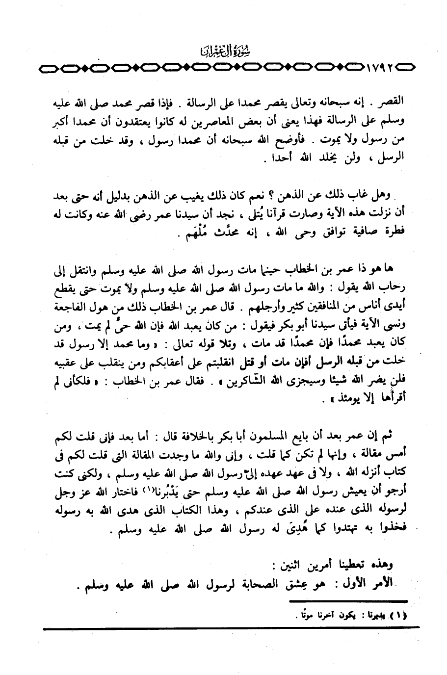 ها هو ذا عمر بن الخطاب حينما مات رسول الله صَلَّى اللَّهُ عَلَيْهِ وَسَلَّم َ وانتقل إلى رحاب الله يقول: والله ما مات رسول الله صَلَّى اللَّهُ عَلَيْهِ وَسَلَّم َ ولا يموت حتى يقطع أيدي أناس من المنافقين كثير وأرجلهم. قال عمر بن الخطاب ذلك من هول الفاجعة ونسي الآية فيأتي سيدنا أبو بكر فيقول: من كان يعبد الله فإن الله حيٌّ لم يمت، ومن كان يعبد محمداً فإن محمداً قد مات، وتلا قوله تعالى: {وَمَا مُحَمَّدٌ إِلاَّ رَسُولٌ قَدْ خَلَتْ مِن قَبْلِهِ الرسل أَفإِنْ مَّاتَ أَوْ قُتِلَ انقلبتم على أَعْقَابِكُمْ وَمَن يَنقَلِبْ على عَقِبَيْهِ فَلَن يَضُرَّ الله شَيْئاً وَسَيَجْزِي الله الشاكرين} . فقال عمر بن الخطاب: «فلكأني لم أقرأها إلا يومئذ» .