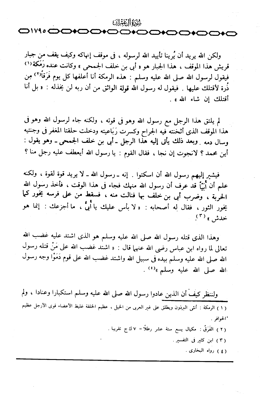 ولكن الله يريد أن يُرينا تأييد الله لرسوله، في موقف إنهاكه وكيف يقف من جبار قريش هذا الموقف، هذا الجبار هو «أبي بن خلف الجمحي» وكانت عنده رَمَكة فيقول لرسول الله صَلَّى اللَّهُ عَلَيْهِ وَسَلَّم َ: هذه الرمكة أنا أعلفها كل يوم فَرَقاً من ذرة لأقتلك عليها. فيقول له رسول الله قولة الواثق من أن ربه لن يخذله: «بل أنا أقتلك إن شاء الله» .