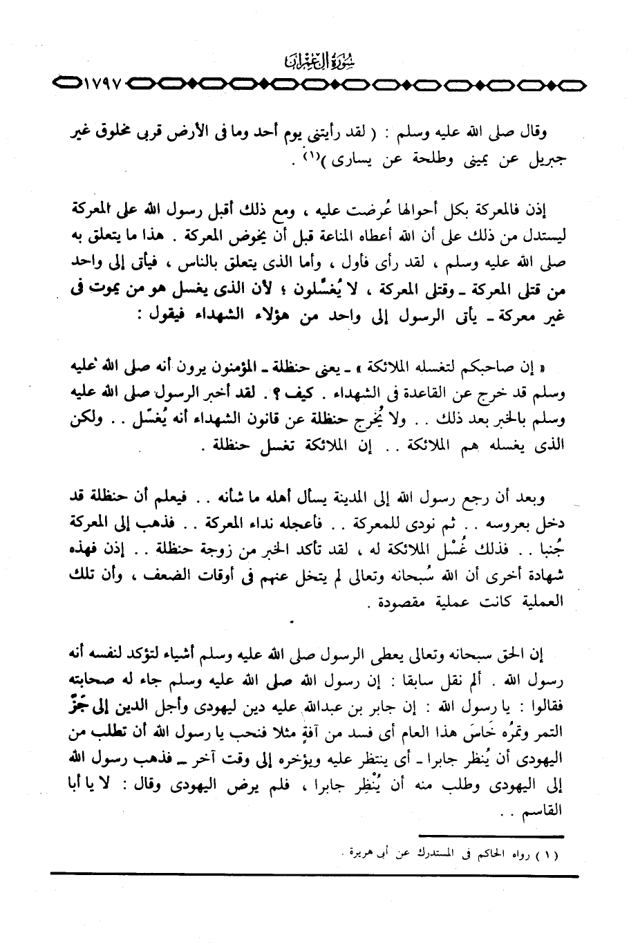 إذن فالمعركة بكل أحوالها عُرضت عليه، ومع ذلك أقبل رسول الله على المعركة ليستدل من ذلك على أن الله أعطاه المناعة قبل أن يخوض المعركة. هذا ما يتعلق به صَلَّى اللَّهُ عَلَيْهِ وَسَلَّم َ، لقد رأى فأول، وأما الذي يتعلق بالناس، فيأتي إلى واحد من قتلى المعركة - وقتلى المعركة، لا يُغسلون؛ لأن الذي يغسل هو من يموت في غير معركة - يأتي الرسول إلى واحد من هؤلاء الشهداء فيقول: «إن صاحبكم لتغسله الملائكة» - يعني حنظلة - المؤمنون يرون أنه صَلَّى اللَّهُ عَلَيْهِ وَسَلَّم َ قد خرج عن القاعدة في الشهداء. كيف؟ لقد أخبر الرسول صَلَّى اللَّهُ عَلَيْهِ وَسَلَّم َ بالخبر بعد ذلك. . ولا يُخرج حنظلة عن قانون الشهداء أنه يُغسّل. . ولكن الذي يغسله هم الملائكة. . إن الملائكة تغسل حنظلة.