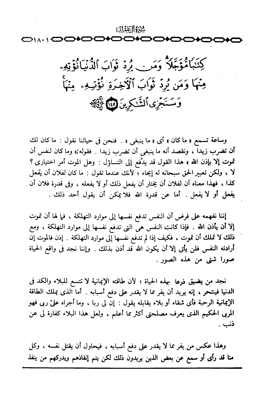 وساعة تسمع «ما كان» أي «ما ينبغي» . فنحن في حياتنا نقول: ما كان لك أن تضرب زيدا، ونقصد أنه ما ينبغي أن تضرب زيدا. فقوله: {وَمَا كَانَ لِنَفْسٍ أَنْ تَمُوتَ إِلاَّ بِإِذْنِ الله} هذا القول قد يدفع إلى التساؤل: وهل الموت أمر اختياري؟ لا، ولكن تعبير الحق سبحانه له إيحاء؛ لأنك عندما تقول: ما كان لفلان أن يفعل كذا، فهذا معناه أن لفلان أن يختار أن يفعل ذلك أو لا يفعله، وفي قدرة فلان أن يفعل أو لا يفعل. أما عن قدرة الله فلا يمكن أن يقول أحد ذلك.