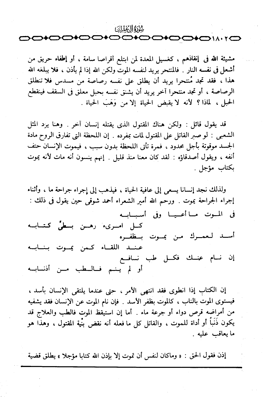 قد يقول قائل: ولكن هناك المقتول الذي يقتله إنسان آخر. وهنا يرد المثل الشعبي: لو صبر القاتل على المقتول لمات بمفرده، إن اللحظة التي تفارق الروح مادة الجسد موقوتة بأجل محدود، فمرة تأتي اللحظة بدون سبب، فيموت الإنسان حتف أنفه، ويقول أصدقاؤه: لقد كان معنا منذ قليل. إنهم ينسون أنه مات لأنه يموت بكتاب مؤجل.