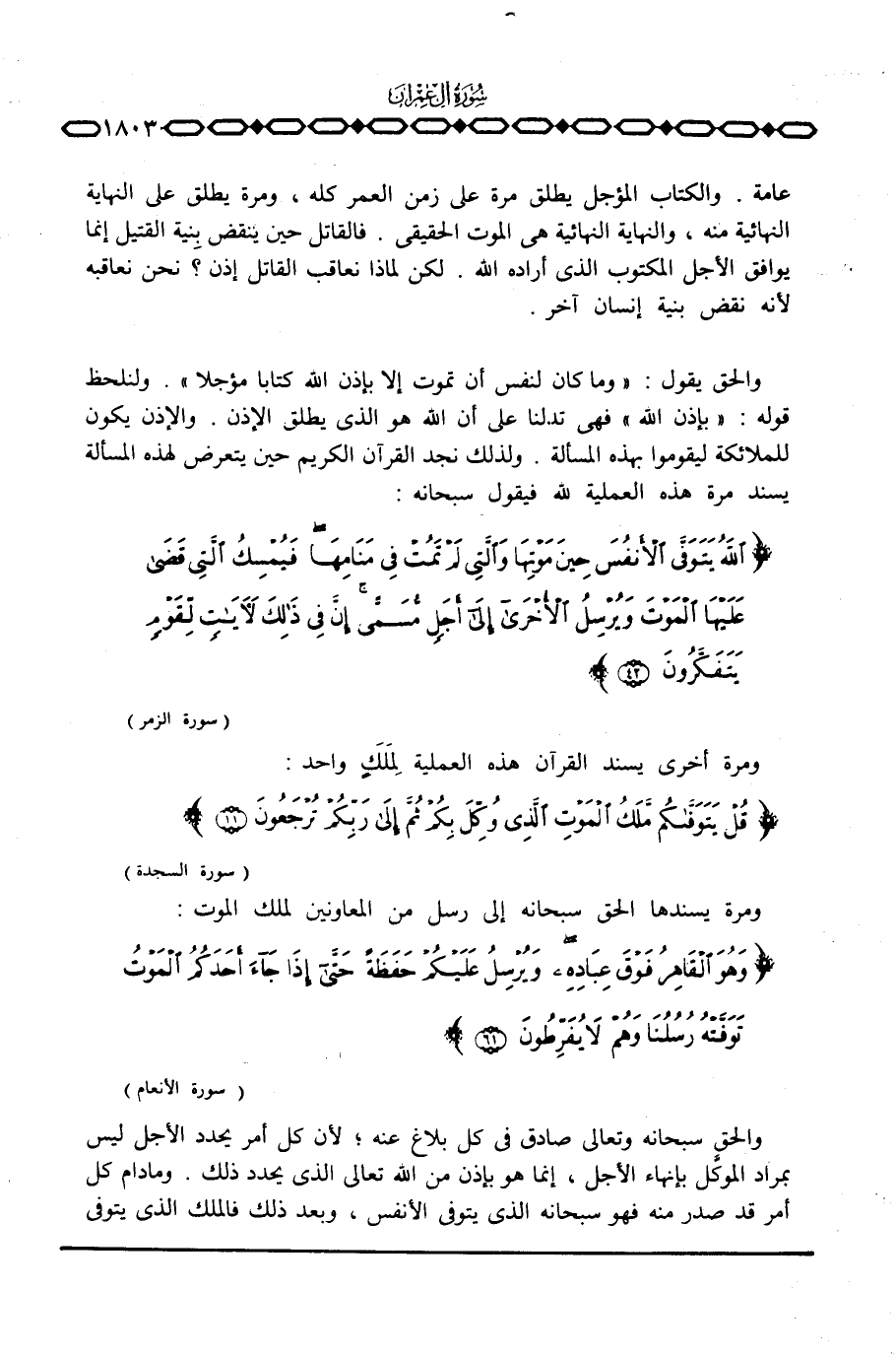 عامة. والكتاب المؤجل يطلق مرة على زمن العمر كله، ومرة يطلق على النهاية النهائية منه، والنهاية النهائية هي الموت الحقيقي. فالقاتل حين ينقض بنية القتيل إنما يوافق الأجل المكتوب الذي أراده الله. لكن لماذا نعاقب القاتل إذن؟ نحن نعاقبه لأنه نقض بنية إنسان آخر.