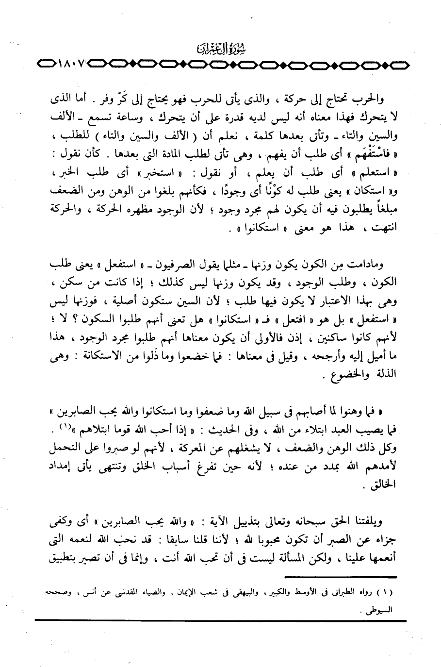 والحرب تحتاج إلى حركة، والذي يأتي للحرب فهو يحتاج إلى كرّ وفر. أما الذي لا يتحرك فهذا معناه أنه ليس لديه قدرة على أن يتحرك، وساعة تسمع - الألف والسين والتاء - وتأتي بعدها كلمة، نعلم أن (الألف والسين والتاء) للطلب، «فاسْتَفْهَم» أي طلب أن يفهم، وهي تأتي لطلب المادة التي بعدها. كأن نقول: «استعلم» أي طلب أن يعلم، أو نقول: «استخبر» أي طلب الخبر، و «استكان» يعني طلب له كوْناً أي وجوداً، فكأنهم بلغوا من الوهن ومن الضعف مبلغاً يطلبون فيه أن يكون لهم مجرد وجود؛ لأن الوجود مظهره الحركة، والحركة انتهت، هذا هو معنى {استكانوا} .