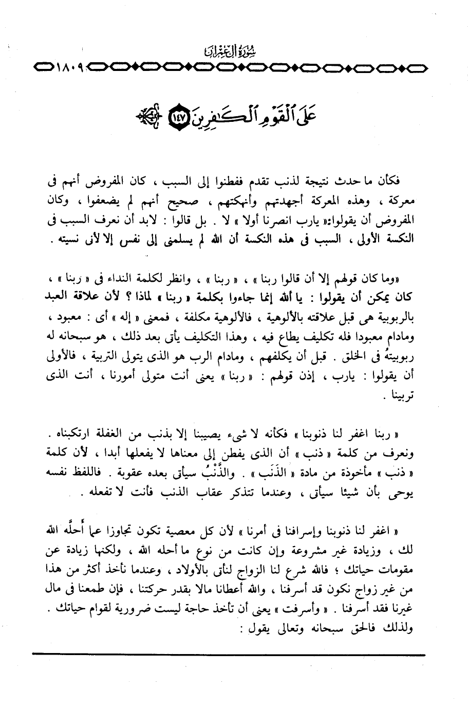 {ربَّنَا اغفر لَنَا ذُنُوبَنَا} فكأنه لا شيء يصيبنا إلا بذنب من الغفلة ارتكبناه. ونعرف من كلمة «ذنب» أن الذي يفطن إلى معناه لا يفعلها أبدا، لأن كلمة «ذنب» مأخوذة من مادة «الذَنَب» . والذَّنْبُ سيأتي بعده عقوبة. فاللفظ نفسه يوحي بأن شيئا سيأتي، وعندما تتذكر عقاب الذنب فأنت لا تفعله.