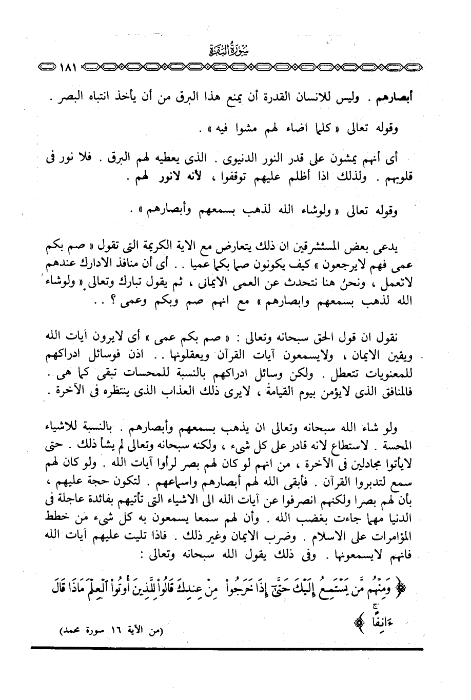 بالنسبة للأشياء المحسة. لاستطاع لأنه قادر على كل شيء، ولكنه سبحانه وتعالى لم يشأ ذلك. حتى لا يأتوا مجادلين في الآخرة، من أنهم لو كان لهم بصر لرأوا آيات الله. ولو كان لهم سمع لتدبروا القرآن. فأبقى الله لهم أبصارهم وأسماعهم. لتكون حجة عليهم، بأن لهم بصرا ولكنهم انصرفوا عن آيات الله إلى الأشياء التي تأتيهم بفائدة عاجلة في الدنيا مهما جاءت بغضب الله. وأن لهم سمعا يسمعون به كل شيء من خطط المؤامرات على الإسلام. وضرب الإيمان وغير ذلك. فإذا تليت عليهم آيات الله فأنهم لا يسمعونها. وفي ذلك يقول الله سبحانه وتعالى: {وَمِنْهُمْ مَّن يَسْتَمِعُ إِلَيْكَ حتى إِذَا خَرَجُواْ مِنْ عِندِكَ قَالُواْ لِلَّذِينَ أُوتُواْ العلم مَاذَا قَالَ آنِفاً} [محمد: 16]