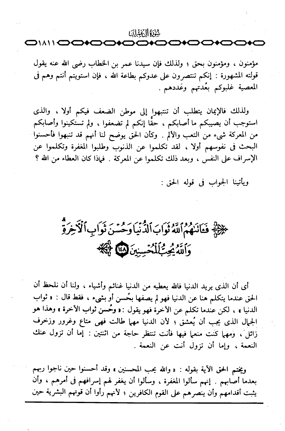 أي أن الذي يريد الدنيا فالله يعطيه من الدنيا غنائم وأشياء، ولنا أن نلحظ أن الحق عندما يتكلم هنا عن الدنيا فهو لم يصفها بحُسن أو بشيء، فقط قال: {ثَوَابَ الدنيا} ، لكن عندما تكلم عن الآخرة فهو يقول: {وَحُسْنَ ثَوَابِ الآخرة} وهذا هو الجمال الذي يجب أن يُعشق؛ لأن الدنيا مهما طالت فهي متاع وغرور وزخرف زائل، ومهما كنت منعماً فيها فأنت تنتظر حاجة من اثنتين: إما أن تزول عنك النعمة، وإما أن تزول أنت عن النعمة.