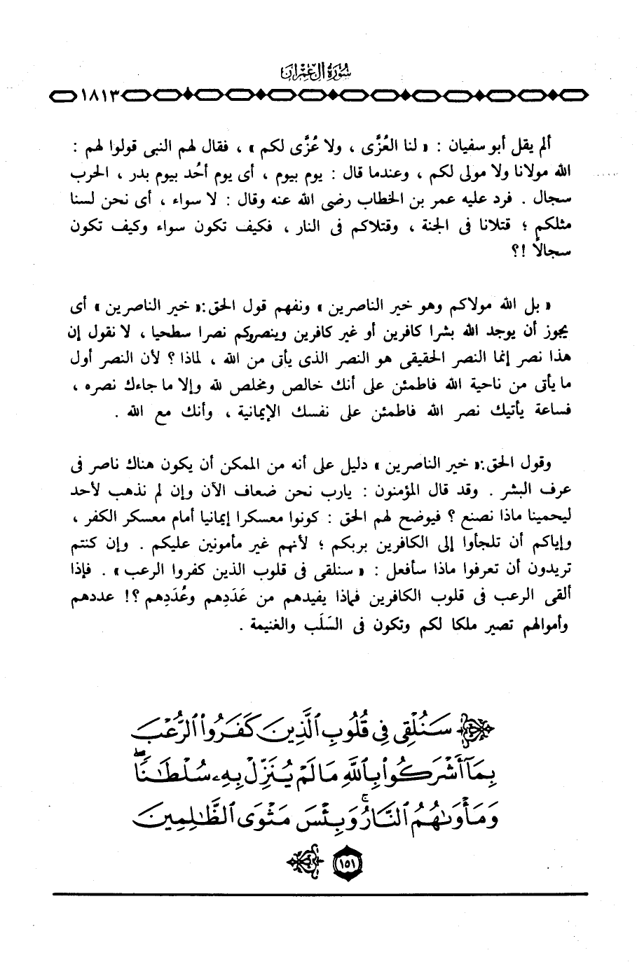 {بَلِ الله مَوْلاَكُمْ وَهُوَ خَيْرُ الناصرين} ونفهم قول الحق: {خَيْرُ الناصرين} أي يجوز ان يوجد الله بشراً كافرين أو غير كافرين وينصروكم نصراً سطحياً، لا نقول ان هذا نصر انما النصر الحقيقي هو النصر الذي ياتي من الله، لماذا؟ لأن النصر أول ما يأتي من ناحية الله فاطمئن على أنك خالص ومخلص لله والا ما جاءك نصره، فساعة يأتيك نصر الله فاطمئن على نفسك الايمانية وانك مع الله. وقول الحق: {خَيْرُ الناصرين} دليل على أنه من الممكن أن يكون هناك ناصر في عرف البشر. وقد قال المؤمنون: يارب نحن ضعاف الآن وإن لم نذهب لأحد ليحمينا ماذا نضع؟ فيوضح لهم الحق: كونوا معسكرا إيمانيا أمام معسكر الكفر، وإياكم أن تلجأوا إلى الكافرين بربكم؛ لأنهم غير مأمونين عليكم. وإن كنتم تريدون أن تعرفوا ماذا سأفعل: {سَنُلْقِي فِي قُلُوبِ الذين كَفَرُواْ الرعب} . فإذا ألقى الرعب في قلوب الكافرين فماذا يفيدهم من عَدَدِهم؟} عددهم وأموالهم تصير ملكا لكم وتكون في السَلَب والغنيمة.