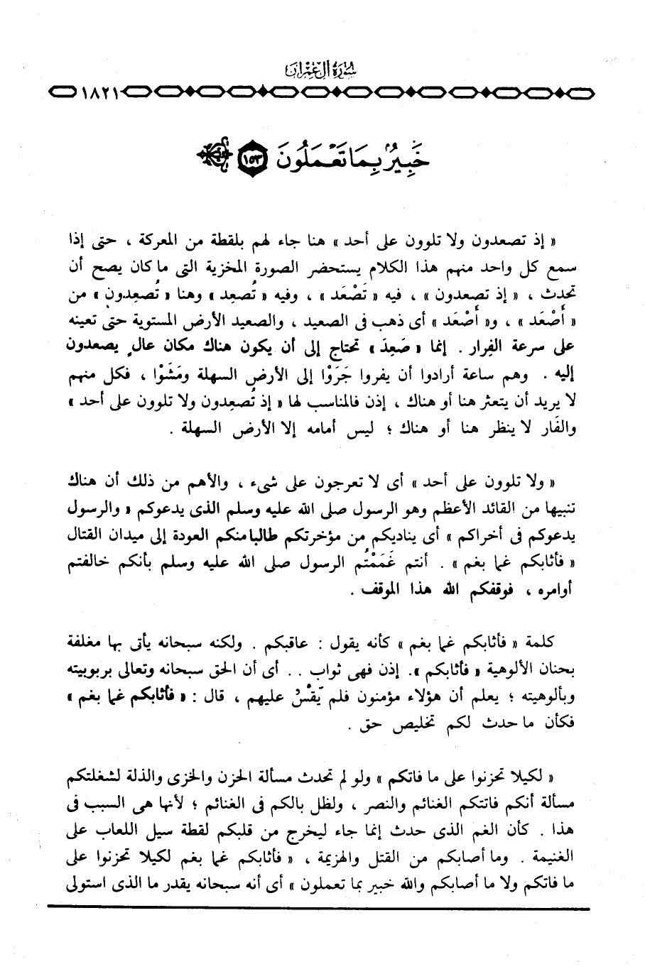 {وَلاَ تَلْوُونَ على أحَدٍ} أي لا تعرجون على شيء، والأهم من ذلك أن هناك تنبيها من القائد الأعظم وهو الرسول صَلَّى اللَّهُ عَلَيْهِ وَسَلَّم َ الذي يدعوكم «والرسول يدعوكم في أخراكم» أي يناديكم من مؤخرتكم طالبا منكم العودة إلى ميدان القتال «فأثابكم غما بغم» . أنتم غَمَمْتُم الرسول صَلَّى اللَّهُ عَلَيْهِ وَسَلَّم َ بأنكم خالفتم أوامره، فوقفكم الله هذا الموقف.