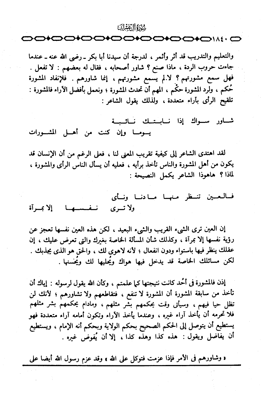 والتعليم والتدريب قد أثر وأثمر، لدرجة أن سيدنا أبا بكر - رَضِيَ اللَّهُ عَنْه - عندما جاءت حروب الردة، ماذا صنع؟ شاور أصحابه، فقال له بعضهم: لا تفعل. فهل سمع مشورتهم؟ لا. لم يسمع مشورتهم، إنما شاورهم. فلإنقاد المشورة حُكم، ولرد المشورة حكْم، المهم أن تحدث المشورة؛ ونعمل بأفضل الآراء فالمشورة: تلقيح الرأي بآراء متعددة، ولذلك يقول الشاعر: