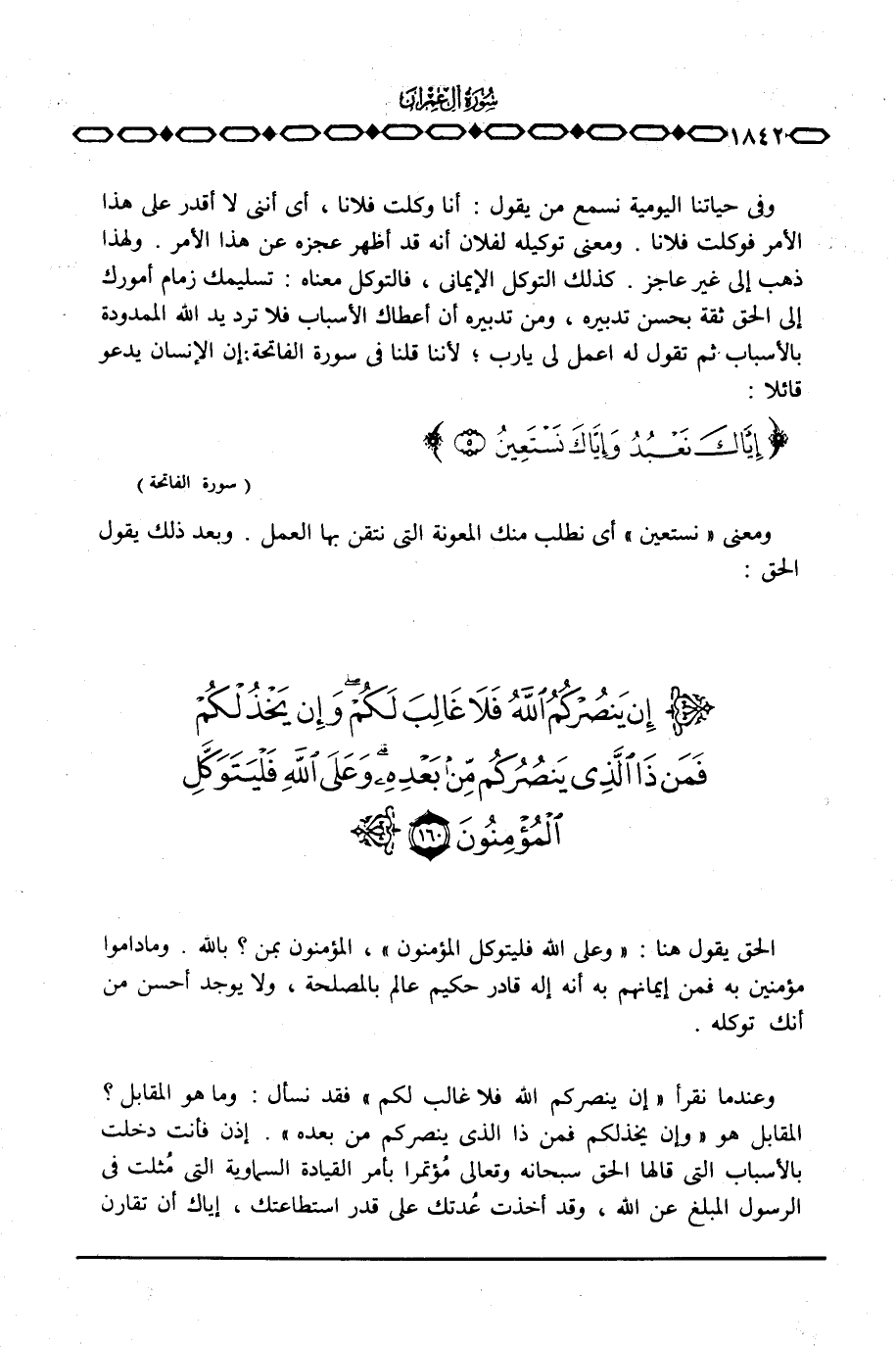 ومعنى «نستعين» أي نطلب منك المعونة التي نتقن بها العمل. وبعد ذلك يقول الحق: {إِن يَنصُرْكُمُ الله فَلاَ غَالِبَ لَكُمْ وَإِن يَخْذُلْكُمْ فَمَن ذَا الذي يَنصُرُكُم مِّنْ بَعْدِهِ ... }