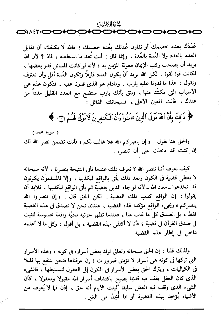 عَدَدَك بعدد خصمك أو تقارن عُدتك بعُدة خصمك؛ فالله لا يكفيك أن تقابل العدد بالعدد ولا العُدة بالعُدة، وإنما قال: أنت تُعد ما استطعته، لماذا؟ لأن الله يريد أن يصحب ركب الإيمان معونة المؤمن به؛ لأنه لو كانت المسائل قدر بعضها، لكانت قوة لقوة. لكن الله يريد أن يكون العدد قليلا وتكون العدة أقل وأن نعترف ونقول: هذا ما قدرنا عليه يارب. ونثق بأنك يارب ستضع مع العدد القليل مدداً من عندك، فأنت المعين الأعلى، فسبحانك القائل: {ذَلِكَ بِأَنَّ الله مَوْلَى الذين آمَنُواْ وَأَنَّ الكافرين لاَ مولى لَهُمْ} [محمد: 11] والحق هنا يقول: {إِن يَنصُرْكُمُ الله فَلاَ غَالِبَ لَكُمْ} فأنت تضمن نصر الله لك إن كنت قد دخلت على أن تنصره.