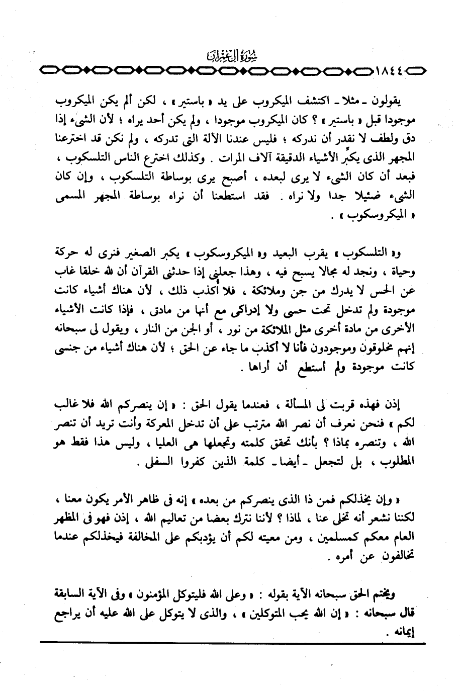 و «التلسكوب» يقرب البعيد و «الميكروسكوب» يكبر الصغير فنرى له حركة وحياة، ونجد له مجالا يسبح فيه، وهذا جعلني إذا حدثني القرآن أن لله خلقا غاب عن الحس لا يدرك من جن وملائكة، فلا أُكذب ذلك، لأن هناك أشياء كانت موجودة ولم تدخل تحت حسى ولا إدراكي مع أنها من مادتي، فإذا كانت الأشياء الأخرى من مادة أخرى مثل الملائكة من نور، أو الجن من النار، ويقول لي سبحانه إنهم مخلوقون وموجودون فأنا لا أكذب ما جاء عن الحق؛ لأن هناك أشياء من جنسي كانت موجودة ولم أستطع أن أراها.