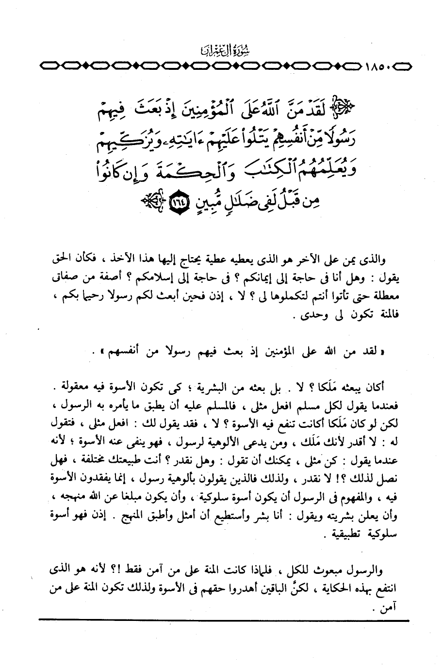 {لَقَدْ مَنَّ الله عَلَى المؤمنين إِذْ بَعَثَ فِيهِمْ رَسُولاً مِّنْ أَنْفُسِهِمْ يَتْلُواْ عَلَيْهِمْ آيَاتِهِ وَيُزَكِّيهِمْ وَيُعَلِّمُهُمُ الكتاب والحكمة ... }