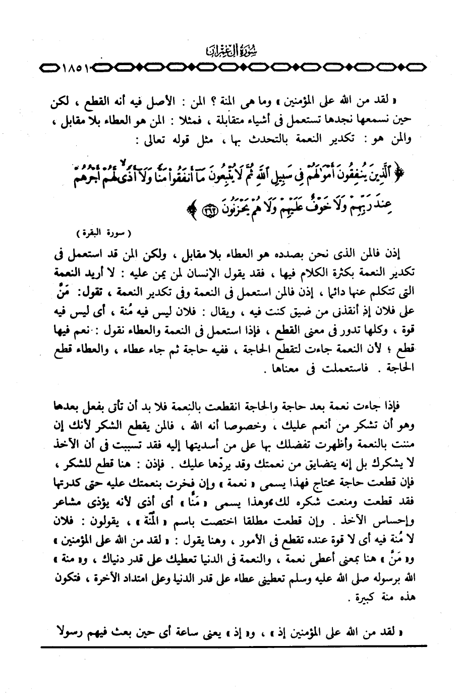 {لَقَدْ مَنَّ الله عَلَى المؤمنين} وما هي المنة؟ المن: الأصل فيه أنه القطع، لكن حين نسمعها نجدها تستعمل في أشياء متقابلة، فمثلا: المن هو العطاء بلا مقابل، والمن هو: تكدير النعمة بالتحدث بها، مثل قوله تعالى: {الذين يُنْفِقُونَ أَمْوَالَهُمْ فِي سَبِيلِ الله ثُمَّ لاَ يُتْبِعُونَ مَآ أَنْفَقُواُ مَنّاً وَلاَ أَذًى لَّهُمْ أَجْرُهُمْ عِنْدَ رَبِّهِمْ وَلاَ خَوْفٌ عَلَيْهِمْ وَلاَ هُمْ يَحْزَنُونَ} [البقرة: 262]