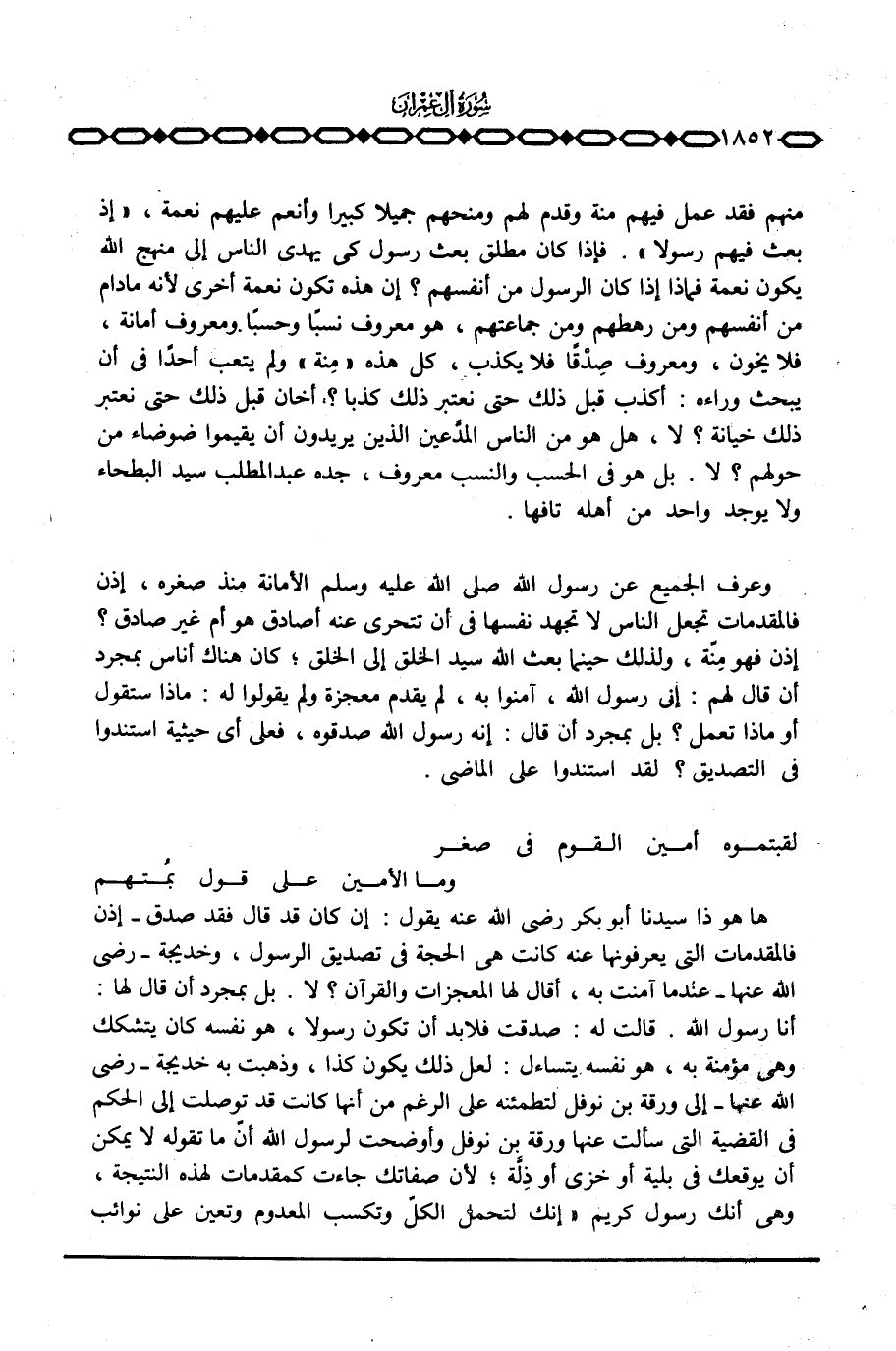 وعرف الجميع عن رسول الله صَلَّى اللَّهُ عَلَيْهِ وَسَلَّم َ الأمانة منذ صغره، إذن فالمقدمات تجعل الناس لا تجهد نفسها في أن تتحرى عنه أصادق هو أم غير صادق؟ إذن فهو مِنّة، ولذلك حينما بعث الله سيد الخلق إلى الخلق؛ كان هناك أناس بمجرد أن قال لهم: إني رسول الله، آمنوا به، لم يقدم معجزة ولم يقولوا له: ماذا ستقول أو ماذا تعمل؟ بمجرد أن قال: إنه رسول الله صدقوه، فعلى أي حيثية استندوا في التصديق؟ لقد استندوا على الماضي.