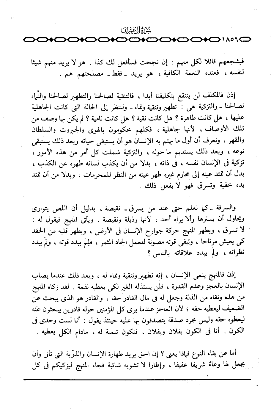 والسرقة - كما نعلم حتى عند من يسرق - نقيصة، بدليل أن اللص يتوارى ويحاول أن يسترها وألا يراه أحد، لأنها رذيلة ونقيصة. ويأتي المنهج فيقول له: لا تسرق، ويطهر المنهج حركة جوارح الإنسان في الأرض، ويطهر قلبه من الحقد كي يعيش مرتاحا، وتبقى قوته مصونة للعمل الجاد المثمر، فلِمَ يبدد قوته، ولم يبدد نظراته، ولم يبدد علاقاته بالناس؟