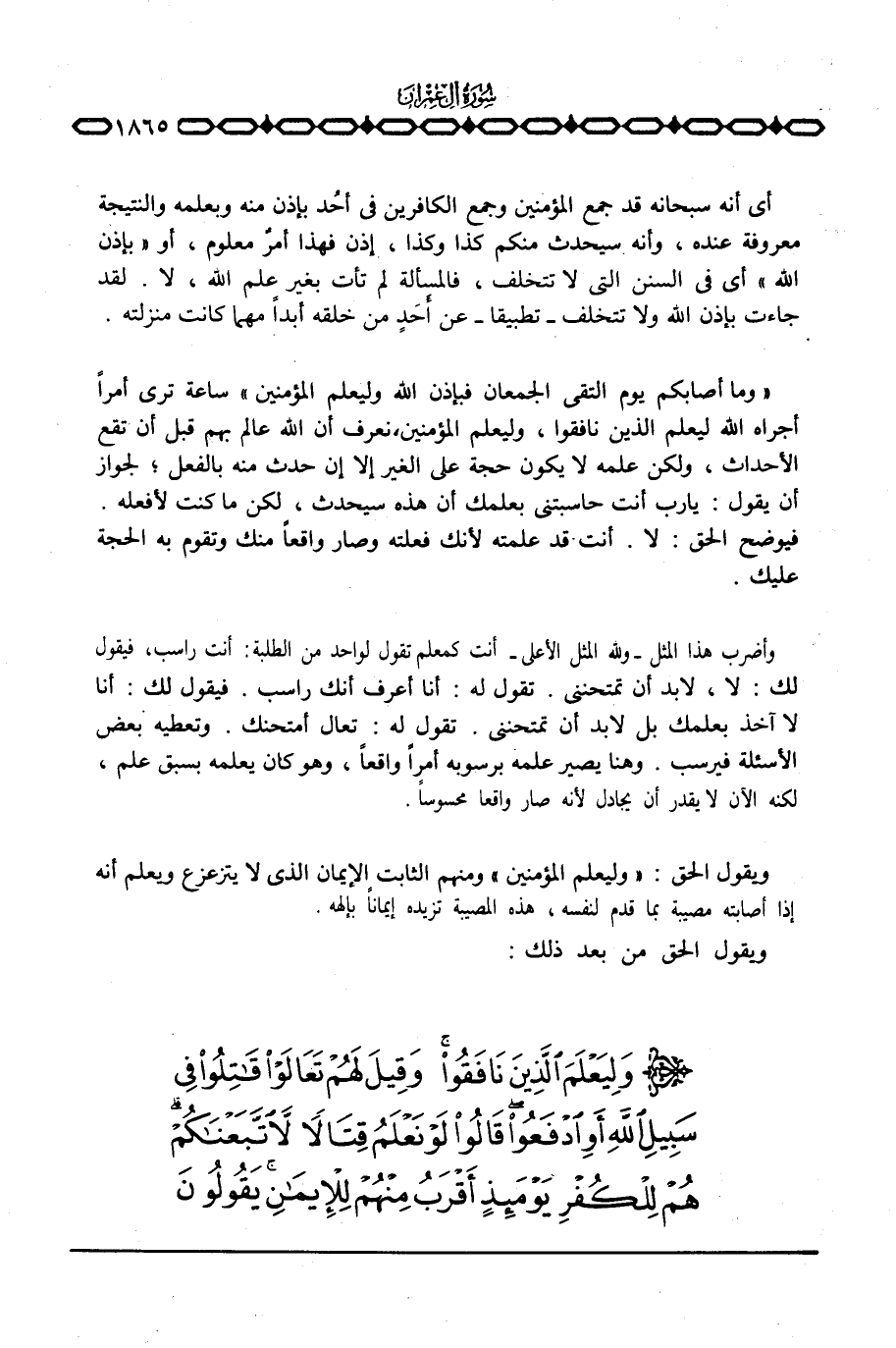 أي أنه سبحانه قد جمع المؤمنين وجمع الكافرين في أحُد بإذن منه وبعلمه والنتيجة معروفة عنده، وأنه سيحدث منكم كذا وكذا، إذن فهذا أمرٌ معلوم، أو {بِإِذْنِ الله} أي في السنن التي لا تتخلف، فالمسألة لم تأت بغير علم الله، لا. لقد جاءت بإذن الله ولا تتخلف - تطبيقا - عن أَحَدٍ من خلقه أبداً مهما كانت منزلته.