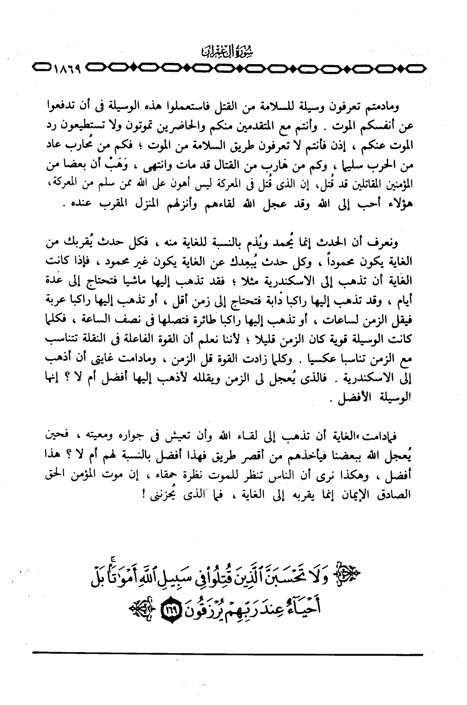 وما دمتم تعرفون وسيلة للسلامة من القتل فاستعملوا هذه الوسيلة في أن تدفعوا عن أنفسكم الموت. وأنتم مع المتقدمين منكم والحاضرين تموتون ولا تستطيعون رد الموت عنكم، إذن فأنتم لا تعرفون طريق السلامة من الموت؛ فكم من مُحارب عاد من الحرب سليما، وكم من هَارب من القتال قد مات وانتهى، وهَبْ أن بعضا من المؤمنين المقاتلين قد قُتل، إن الذي قُتل في المعركة ليس أهون على الله ممن سلم من المعركة، هؤلاء أحب إلى الله وقد عجل الله لقاءهم وأنزلهم المنزل المقرب عنده.