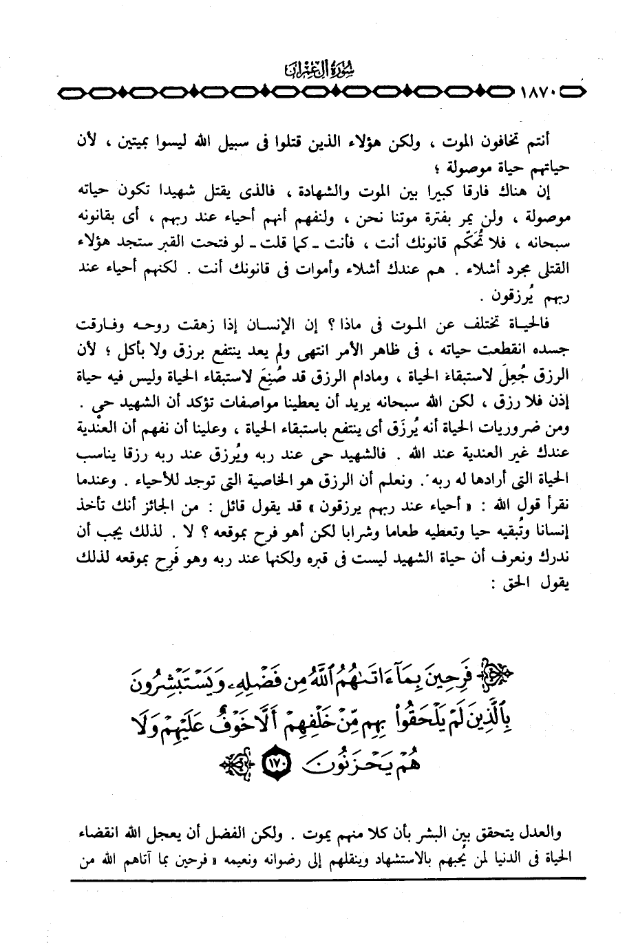 أنتم تخافون الموت، ولكن هؤلاء الذين قتلوا في سبيل الله ليسوا بميتين، لأن حياتهم حياة موصولة؛