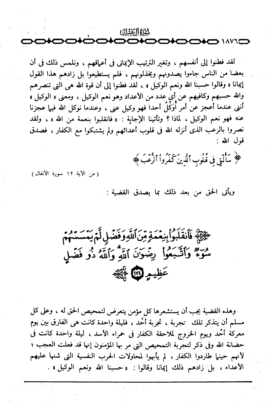 لقد فطنوا إلى أنفسهم، وتغير الترتيب الإيماني في أعماقهم، ونلمس ذلك في أن بعضا من الناس جاءوا يصدونهم ويخذلونهم، فلم يستطيعوا بل زادهم هذا القول إيمانا {وَقَالُواْ حَسْبُنَا الله وَنِعْمَ الوكيل} ، لقد فطنوا إلى أن قوة الله هي التي تنصرهم والله حسبهم وكافيهم عن أي عدد من الأعداد وهو نعم الوكيل، ومعنى «الوكيل» أنني عندما أعجز عن أمر أُوَكِّلُ أحدا فهو وكيل عني، وعندما نوكل الله فيما عجزنا عنه فهو نعم الوكيل، لماذا؟ وتأتينا الإجابة: {فانقلبوا بِنِعْمَةٍ مِّنَ الله} ، ولقد نصروا بالرعب الذي أنزله الله في قلوب أعدائهم ولم يشتبكوا مع الكفار، فصدق قول الله: {سَأُلْقِي فِي قُلُوبِ الذين كَفَرُواْ الرعب} [الأنفال: 12]